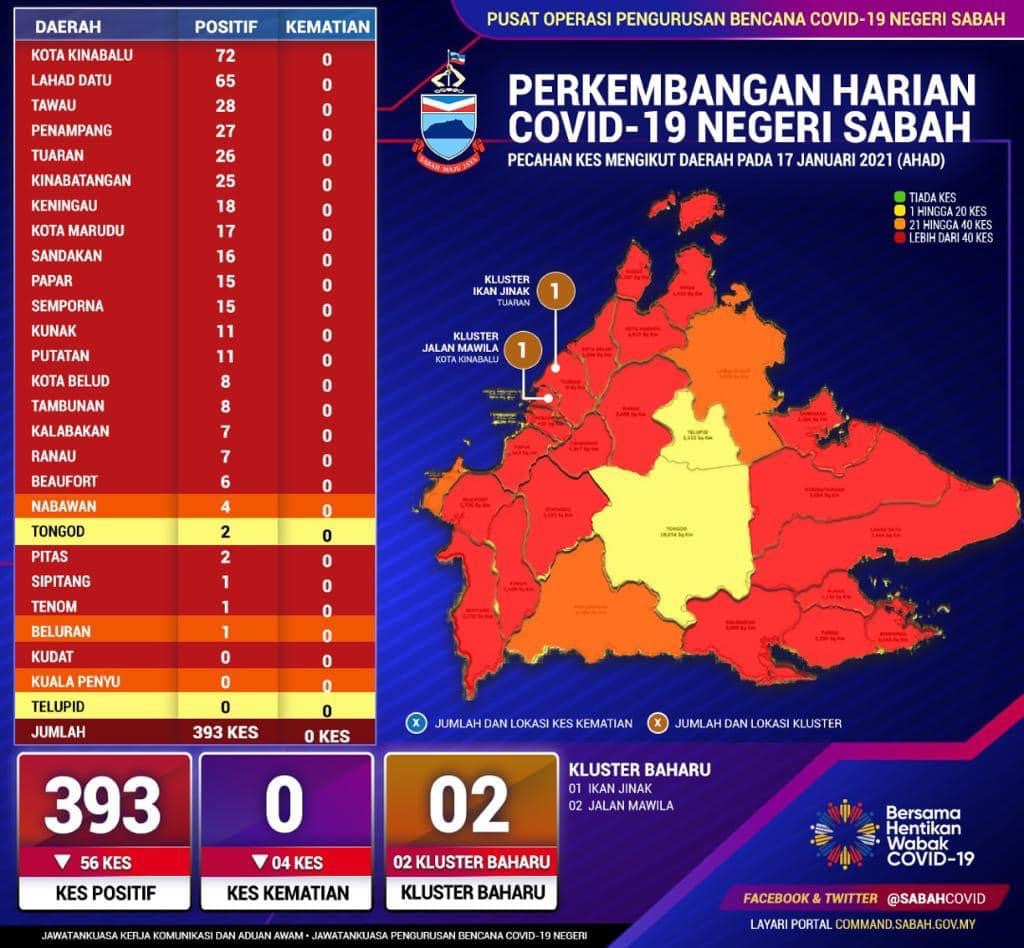 KOTA KINABALU 17 Jan. – Jabatan Kesihatan Sabah hari ini merekodkan 393 kes baharu Covid-19 menjadikan jumlah kumulatif sebanyak 43,644 kes. Seramai 337 pesakit Covid-19 telah discaj dari hospital menjadikan jumlah kumulatif sembuh 39,326 orang. Sejumlah 2,949 pesakit sedang menerima rawatan iaitu 766 orang di hospital dan 2,185 orang di Pusat Kuarantin dan Rawatan Berisiko Rendah (PKRC) Bilangan pesakit Covid-19 dalam ICU ialah 84 orang dan 21 orang pula memerlukan alat bantuan pernafasan (ventilated). Daripada 393 kes positif Covid-19 yang direkodkan, sebanyak 222 kes (56.5%) adalah berpunca dari saringan kontak…