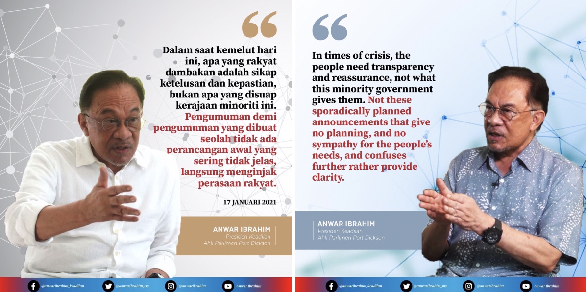 KERAJAAN semakin hilang wibawa dan keyakinan semakin payah untuk dipulihkan di bawah kepimpinan Perdana Menteri Muhyiddin Yassin., kata Ketua Pembangkang, Anwar Ibrahim. Beliau berkata, langkah mengisytiharkan darurat tampak terdesak dan melulu, tanpa sebarang asas yang kukuh, langsung melebarkan jurang antara rakyat dan kerajaan. “Muhyiddin minta kita percaya dia tatkala kediktatoran beliau semakin menonjol. Keyakinan terhadap kepimpinan beliau semakin merosot tatkala seorang demi seorang Ahli Parlimen menarik sokongan. Apakah kita masih boleh percaya dengan kerajaan hari ini? “Pengisytiharan darurat semacam tidak ada kaitan dengan usaha dan upaya kita untuk melawan dampak…