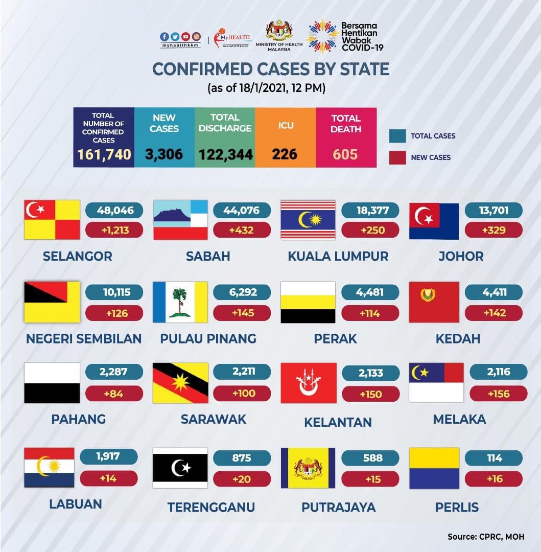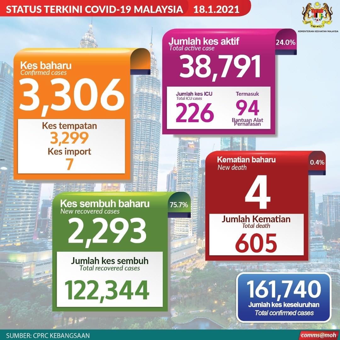 PUTRAJAYA 18 Jan. – Malaysia mencatatkan 3,306 kes baharu Covid-19, menjadikan jumlah kumulatif kes jangkitan virus di negara ini meningkat kepada 161,740. Ketua Pengarah Kesihatan, Dr Noor Hisham Abdullah berkata, daripada jumlah itu, 3,299 kes adalah penularan tempatan dan tujuh lagi jangkitan dari luar negara. Sebanyak 107 kes (3.2 peratus) yang dilaporkan pula adalah berkaitan kluster-kluster di lokap, depot tahanan imigresen, dan penjara yang membabitkan Kluster Penjara Jalan Harapan (65 kes), Kluster Tembok Mempaga (35 kes), Kluster Tembok Nanas (4 kes), Kluster Damai Pelangi (2 kes), dan Kluster Pagar Siput…