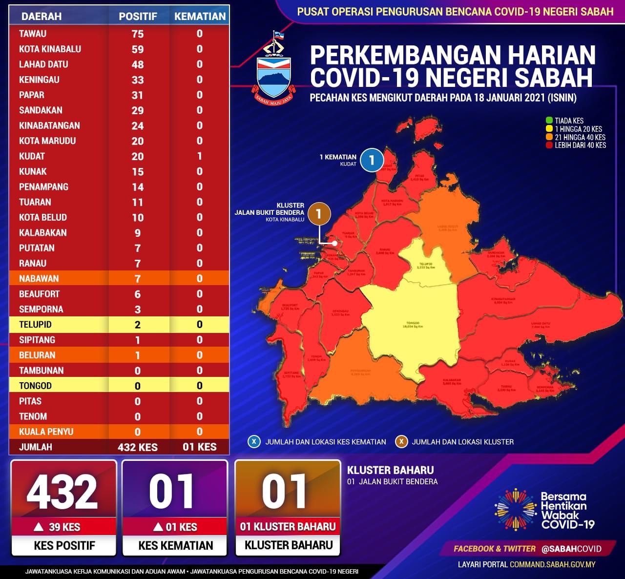KOTA KINABALU 18 Jan. – Jabatan Kesihatan Negeri Sabah, merekodkan 432 kes positif baharu Covid-19 pada hari ini, menjadikan jumlah kumulatif sebanyak 44,076 dengan satu kematian baharu direkodkan di Kudat. Pada masa sama, seramai 438 pesakit Covid-19 sembuh menjadikan jumlah kumulatif sembuh 39,764 orang sementara 2,906 pesakit sedang menerima rawatan iaitu 794 orang di hospital dan 2,112 orang di Pusat Kuarantin dan Rawatan Berisiko Rendah (PKRC) Seramai 91 pesakit Covid-19 dalam ICU dan 23 orang pula memerlukan alat bantuan pernafasan (ventilated). Daripada 432 kes positif Covid-19 yang direkodkan, sebanyak 308…