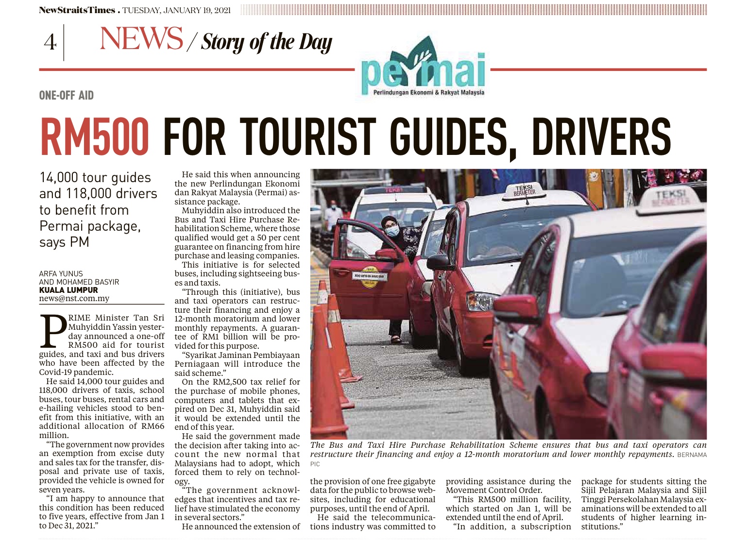Perdana Menteri, Muhyiddin Yassin berkata, pemberian itu akan memberi manfaat kepada 14,000 pemandu pelancong serta 118,000 pemandu teksi, bas sekolah, bas persiaran, kereta sewa dan e-hailing dengan peruntukan tambahan sebanyak RM66 juta.