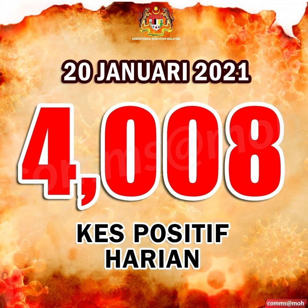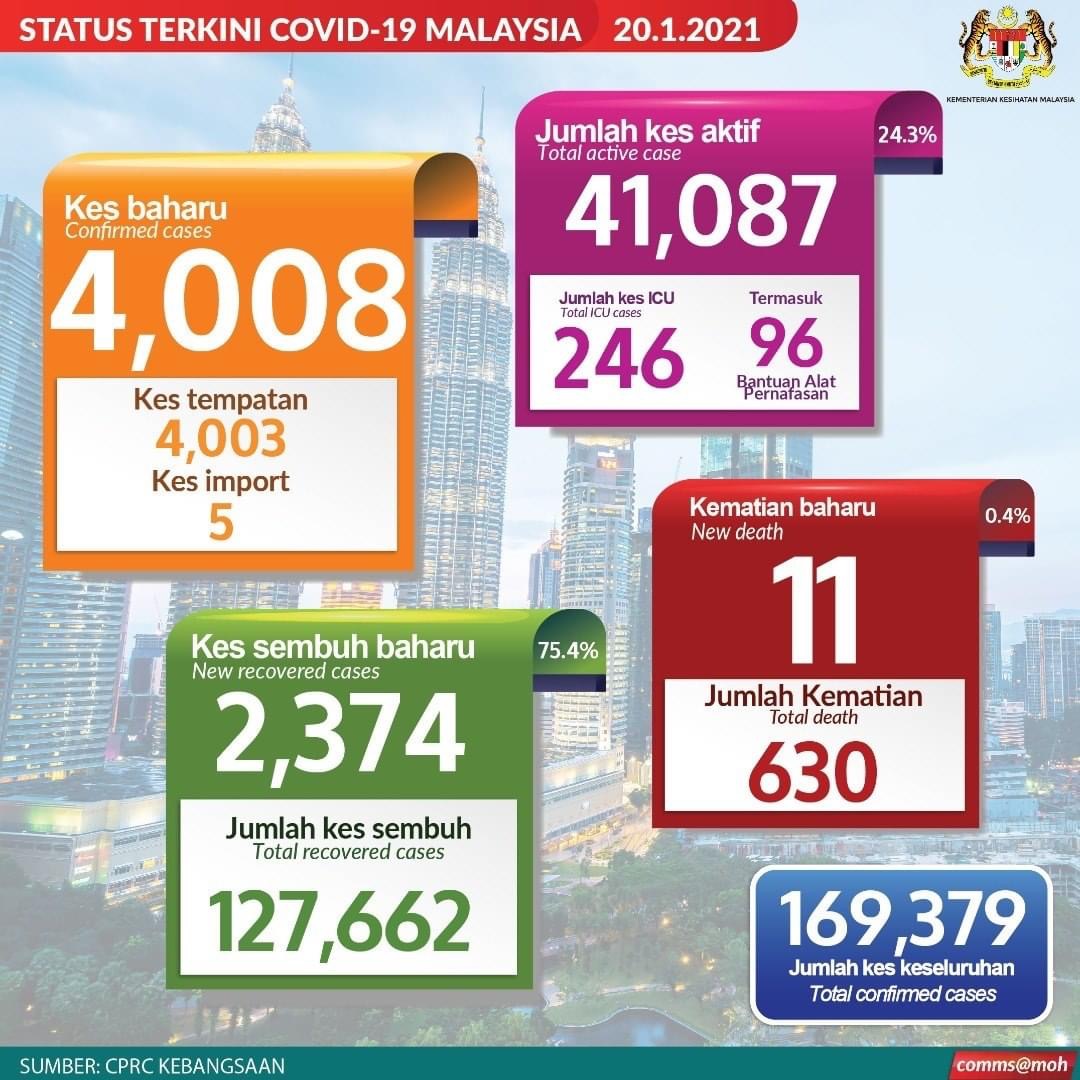 PUTRAJAYA 20 Jan. – Malaysia merekodkan kes harian melebihi angka 4,000 hari ini, selepas 4,008 lagi kes direkodkan dalam tempoh 24 jam lalu menjadikan jumlah kumulatif kes Covid-19 dalam negara adalah sebanyak 169,379.
