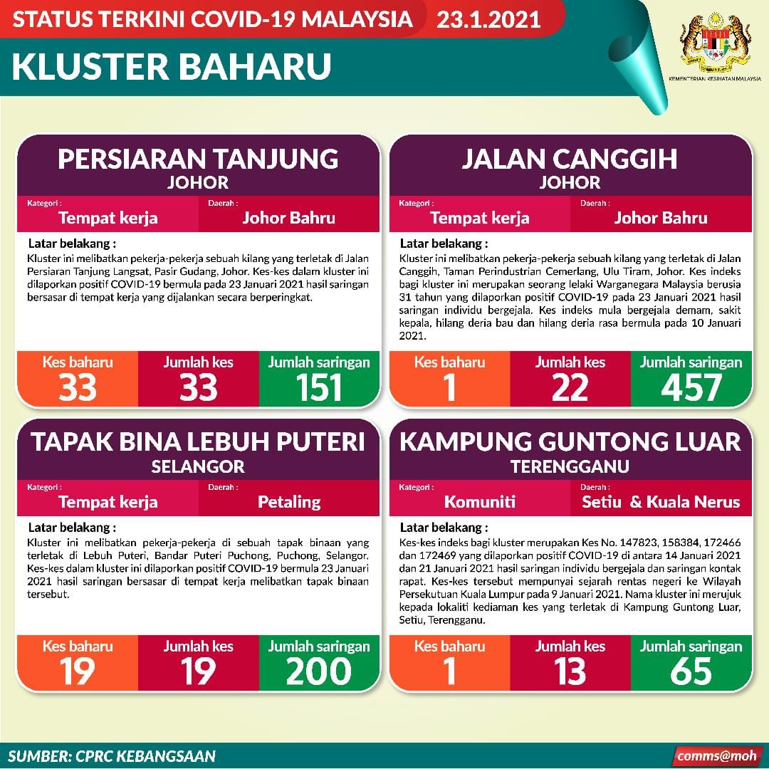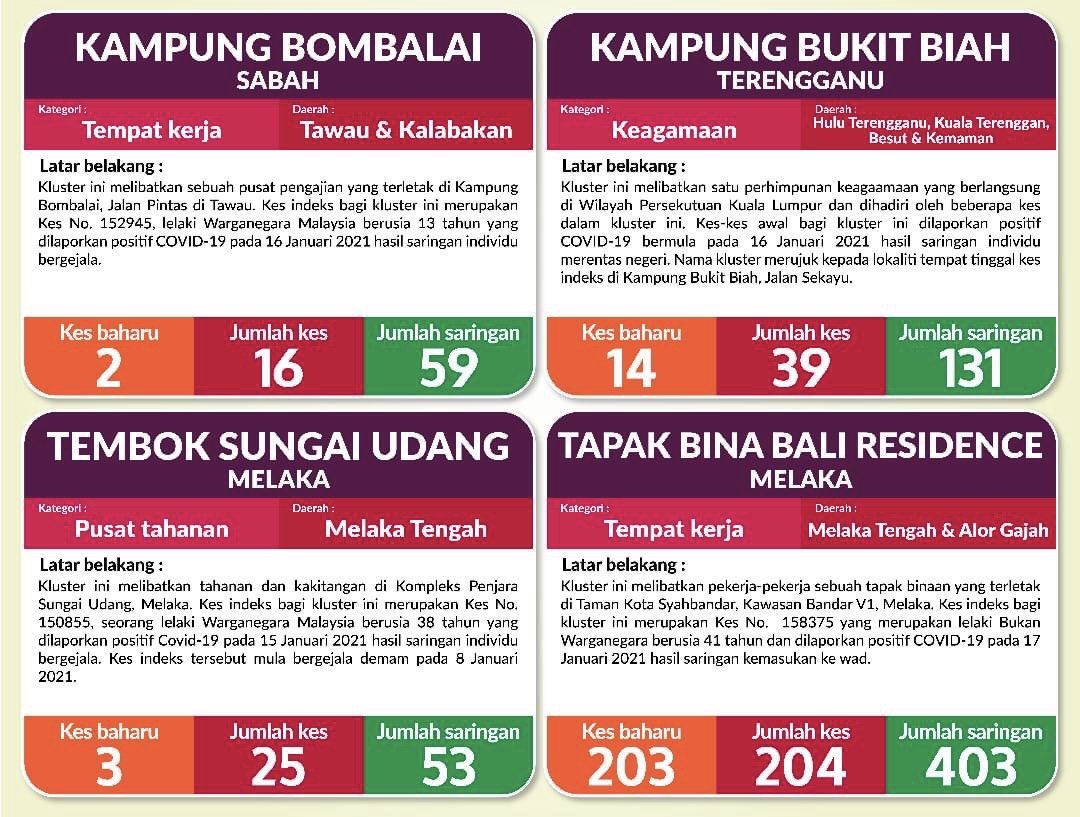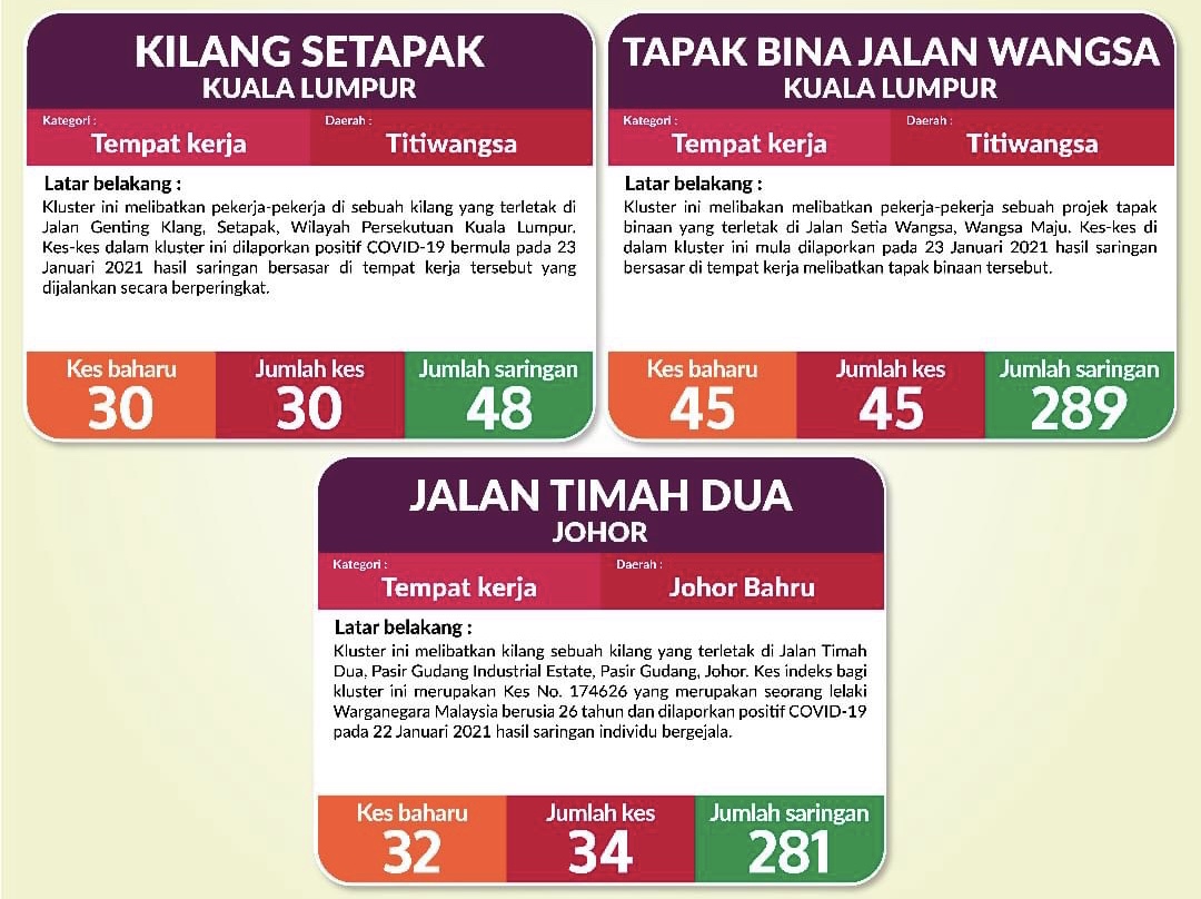 Ketua Pengarah Kesihatan, Dr Noor Hisham Abdullah berkata, setakat semalam (22 Januari), sejumlah 350 kluster baharu telah dilaporkan, dengan 225 kluster (64.3 peratus) merupakan kluster berkaitan tempat kerja.