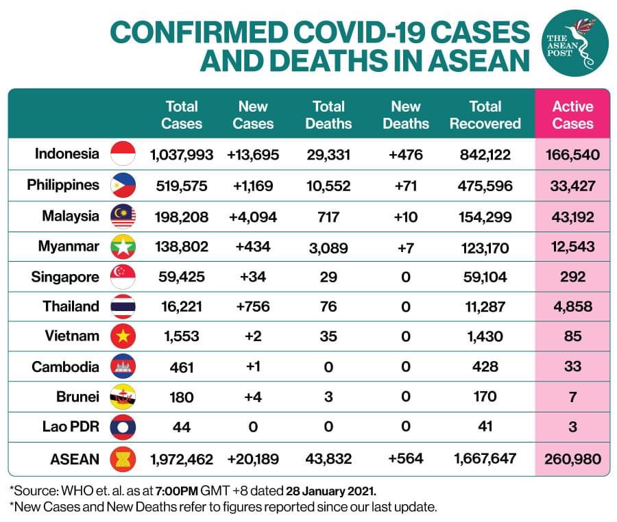 BANGKOK 28 Jan. – Thailand merekodkan 756 kes baharu sepanjang tempoh 24 jam yang lepas, menjadikan jumlah keseluruhan kes positif di negara itu 16,221 dengan kematian kekal 76. Menurut Penolong jurucakap Pusat Pentadbiran Situasi Covid-19 (CCSA) Dr Apisamai Srirangsan, 10 lagi adalah kes import. Daripada 756 kes baharu itu, 746 adalah jangkitan tempatan – 724 melalui pengesanan kes aktif termasuk 710 pekerja migran dan 14 warga Thailand manakala 22 kes pesakit yang mendapatkan rawatan di hospital. Penularan wabak terbaru di negara ini sejak pertengahan Disember merebak ke 63 wilayah. Bagaimanapun, 47 wilayah tiada kes baharu dalam…