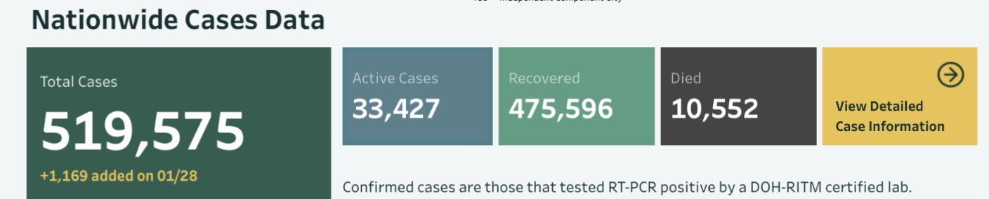 MANILA 28 Jan. – Jabatan Kesihatan Filipina (DoH) setakat pukul 4 petang ini menunjukkan penurunan kes harian jangkitan, kematian dan sembuh berbanding semalam. Menurut DoH, kes baharu Covid-19 yang direkodkan hari ini adalah 1,169 berbanding 2,245 kes semalam yang menjadikan jumlah kumulatif setakat ini 519,575. Sebanyak 71 lagi pesakit Covid-19 meninggal dunia berbanding 95 kematian semalam dan ini membawa kepada 10,552 kematian. Kes sembuh pula mencatatkan 60 kes berbanding 140 semalam dan dengan perkembangan ini menjadikan jumlah pesakit sembuh meningkat kepada 475,596.