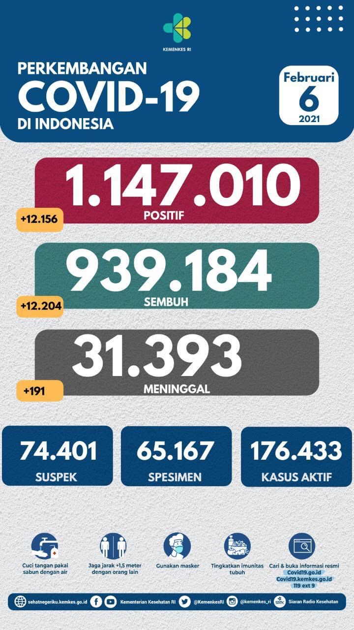 JAKARTA 6 Feb. – Sebanyak 12,156 kes baharu Covid-19 direkodkan di Indonesia dalam tempoh 24 jam lepas menjadikan jumlah keseluruhan kes 1,147,010