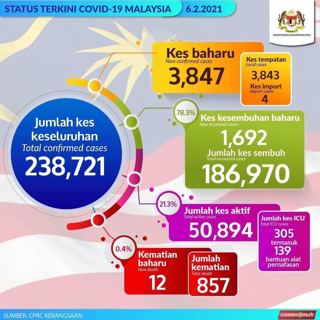 KUALA LUMPUR 6 Feb. – Sebanyak 3,847 kes baharu COVID-19 direkodkan dalam tempoh 24 jam lepas, menjadikan jumlah keseluruhan kes mencecah 238,721 kes dengan kes aktif kebolehjangkitan kini mencecah 50,894.