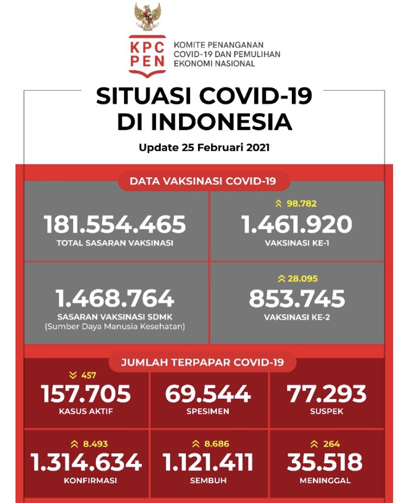 JAKARTA 25 Feb. – Penerima vaksin Covid-19 di Indonesia kini mencecah 1,461,920 ketika jumlah kumulatif kes jangkitan pula meningkat kepada 1,314,634 berikutan pertambahan 8,493 kes baharu.