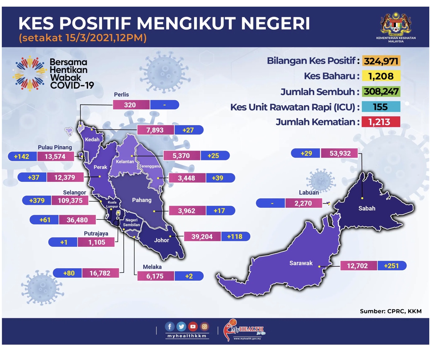 - 65 kes daripada kluster-kluster, termasuk tujuh kes daripada kluster-kluster baharu iaitu Kluster Perusahaan Amari, Kluster Sungai Puloh, dan Kluster Batu Tiga Lama;