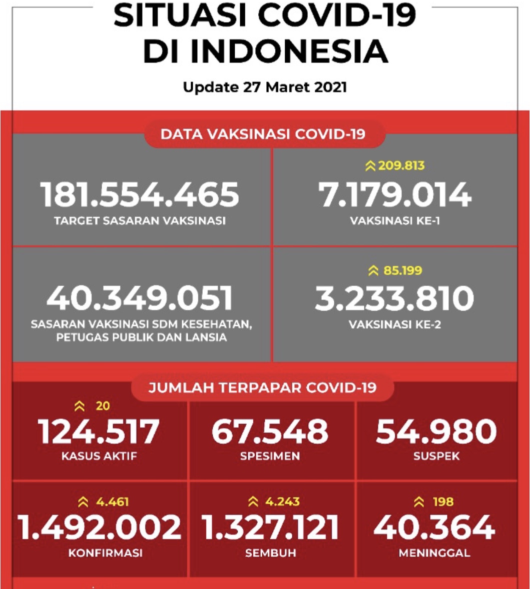 JAKARTA 27 Mac – Indonesia setakat hari ini, Sabtu merekodkan 1.49 juta kes positif Covid-19 termasuk 4,461 kes baharu yang direkodkan dalam tempoh 24 jam (12 tengah hari 26/03 – 12 tengah hari ini).