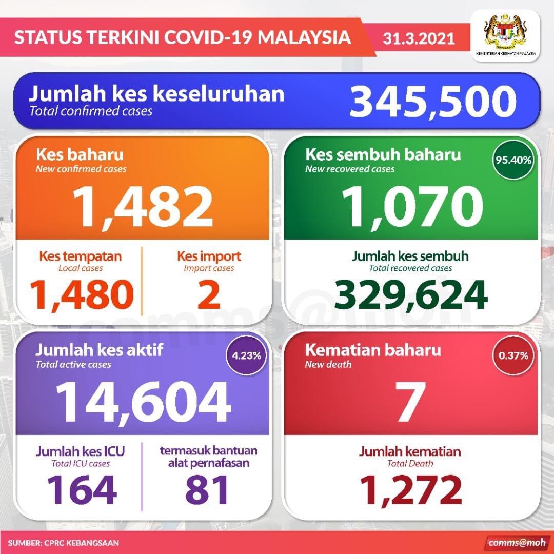 PUTRAJAYA 31 Mac – Jumlah kes jangkitan harian Covid-19 hari ini kembali meningkat apabila merekodkan 1,482 kes baharu menjadikan jumlah kumulatif sebanyak 345,500 kes.