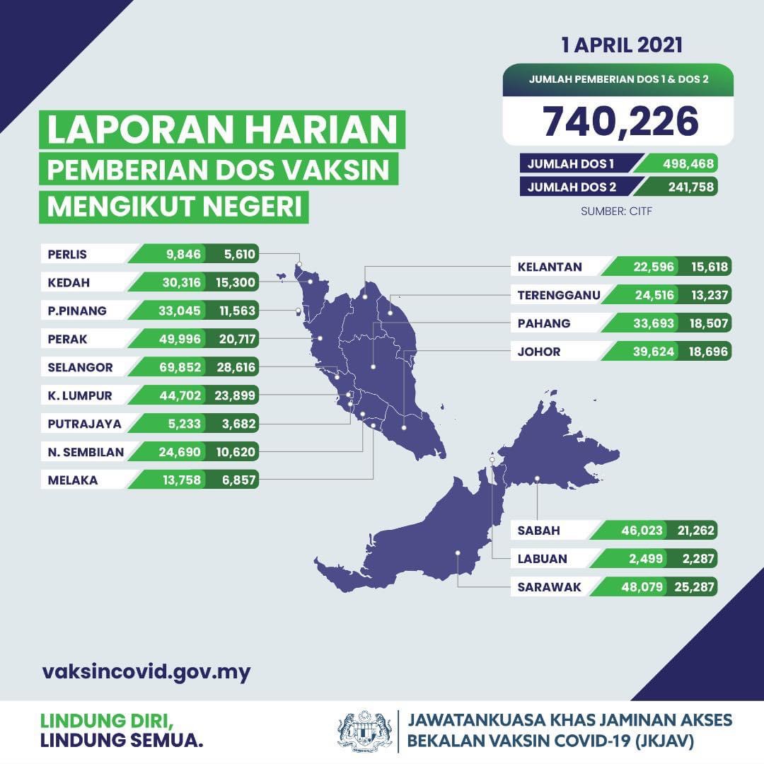 Menteri Kesihatan Dr Adham Baba berkata bagi tempoh sama, 498,468 individu telah menerima dos pertama, menjadikan jumlah keseluruhan pemberian dos pertama dan kedua vaksin Covid-19 di negara kini adalah 740,226.