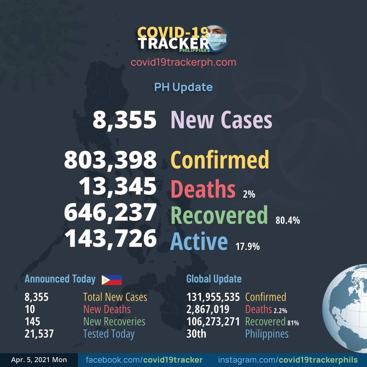 MANILA 5 April – Jumlah kes jangkitan Covid-19 yang direkodkan Filipina terus mencatatkan peningkatan dengan melebihi 800,000 kes apabila 8,355 kes baharu direkodkan menjadikan jumlah keseluruhan 803,398 kes.