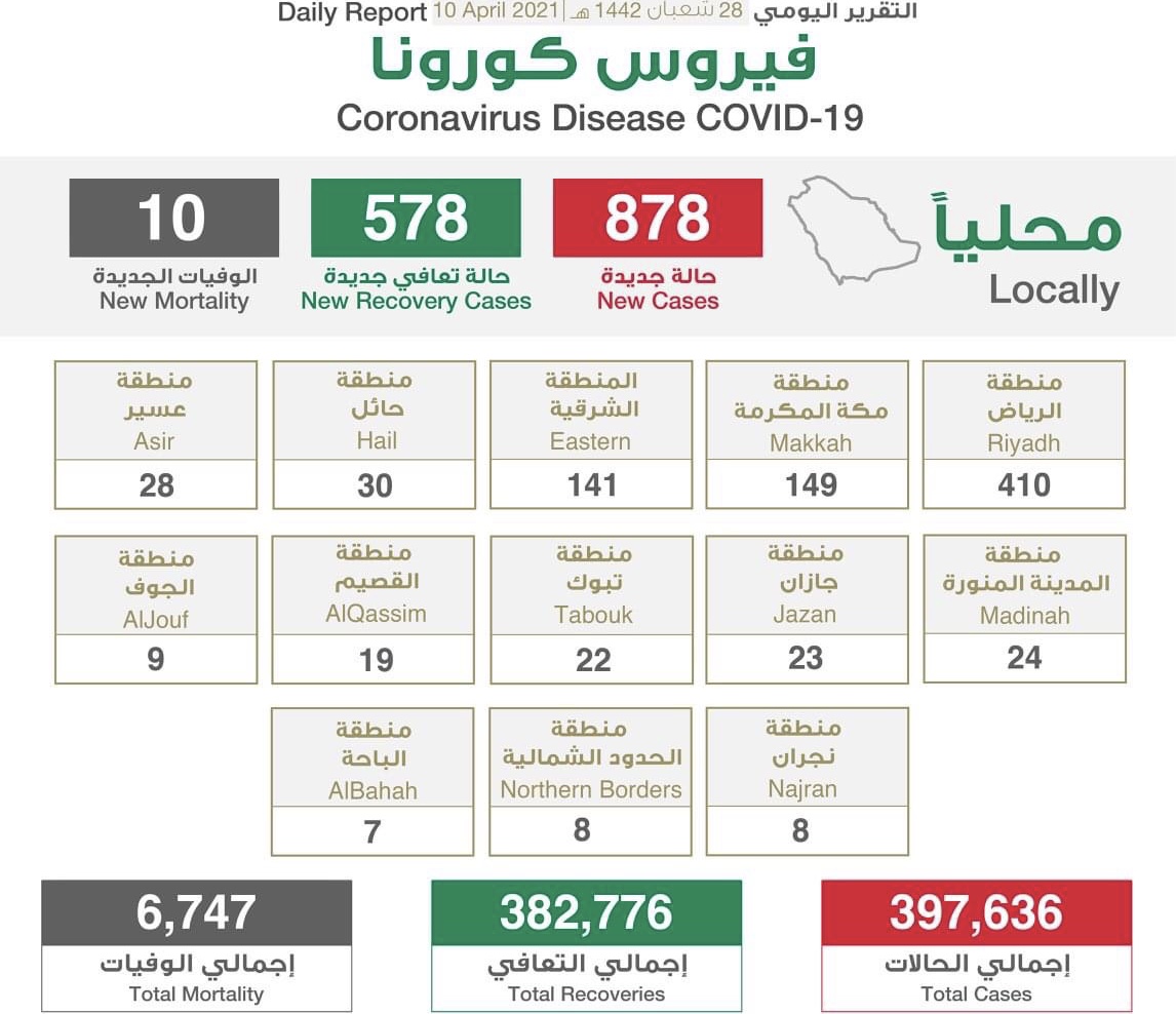 RIYADH 10 April – Jumlah kes jangkitan Covid-19 di Arab Saudi menghampiri 900 kes apabila merekodkan 878 kes baharu hari ini menjadikan jumlah keseluruhan 397,636.