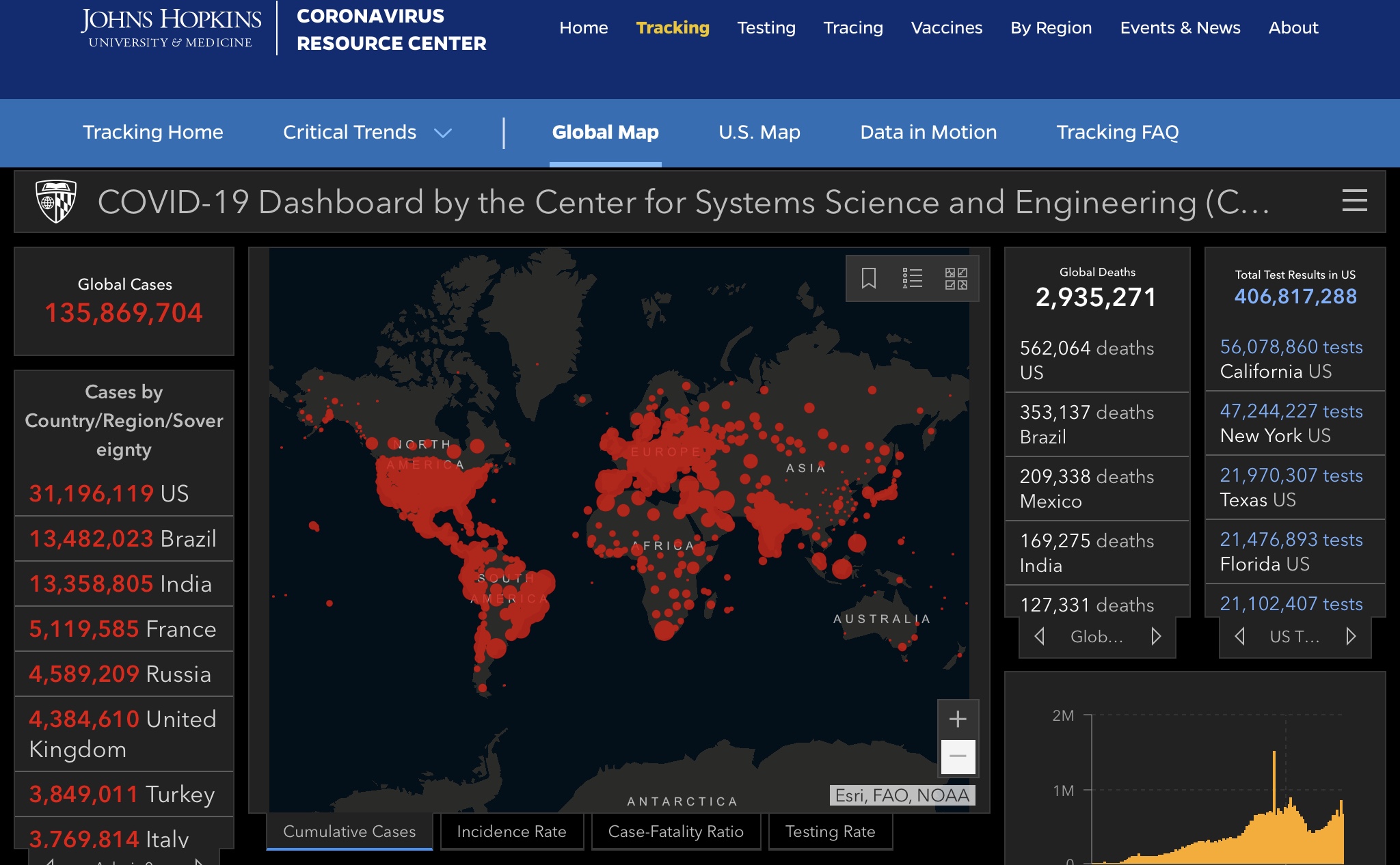 Daripada 135,855,351 kes seluruh dunia, AS merekodkan 31,196,121 kes dan 562,064 orang meninggal dunia daripada 2,934,981 kematian global.