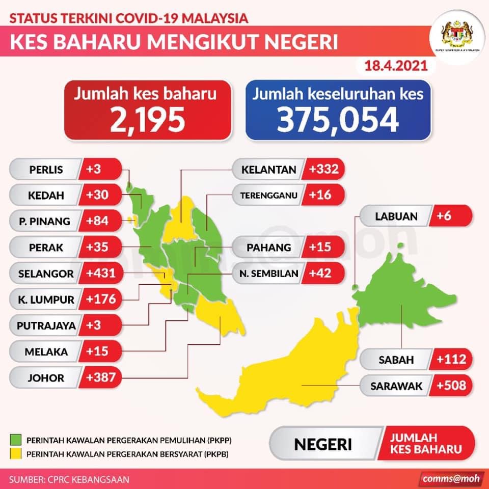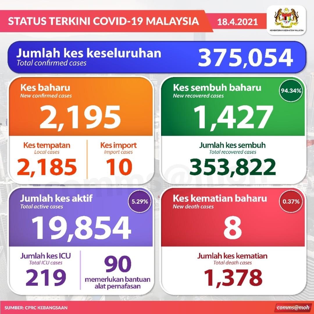 PUTRAJAYA 18 April – Turun sedikit berbanding semalam tetapi masih mencecah empat angka dengan jumlah kes positif yang dilaporkan dalam tempoh 24 jam sebanyak 2,195 kes menjadikan jumlah kumulatif 372,859. Ketua Pengarah Kesihatan, Dr Noor Hisham Abdullah berkata, sebanyak 18 kes atau 0.8 peratus yang dilaporkan pula adalah berkaitan kluster-kluster di penjara dan Depot Tahanan Imigresen (DTI) yang membabitkan Kluster Jalan Salleh (11 kes), Kluster Tembok Pengkalan Chepa (5 kes), Kluster Tembok Sri Aman (1 kes), dan Kluster DTI Lenggeng (1 kes). Manakala jumlah kes sembuh pula adalah sebanyak 1,427 kes…