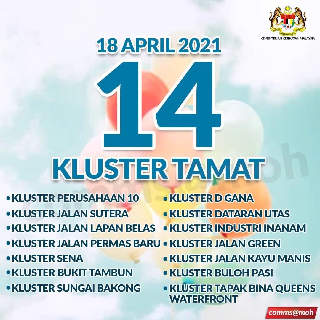 PUTRAJAYA 18 April – Jumlah kluster meningkat kepada 1,520 termasuk lima kluster baharu hari ini yang melibatkan tiga kluster tempat kerja, dan masing-masing satu komuniti dan sekolah/ institusi pendidikan Kementerian Pendidikan Malaysia (KPM). Daripada jumlah itu, 1,182 tamat termasuk 14 kluster yang tamat hari ini. Jumlah kluster aktif pula 338 dengan 64 menunjukkan pertambahan kes baharu termasuk Kluster Jalan Perindustrian Satu (249 kes), Kluster Kok Lanas (74 kes), dan Kluster Kampung Bunut Sarang Burung (43 kes). KLUSTER SELAT KLANG Kluster tempat kerja ini melibatkan daerah Klang dan Petaling di Selangor.…