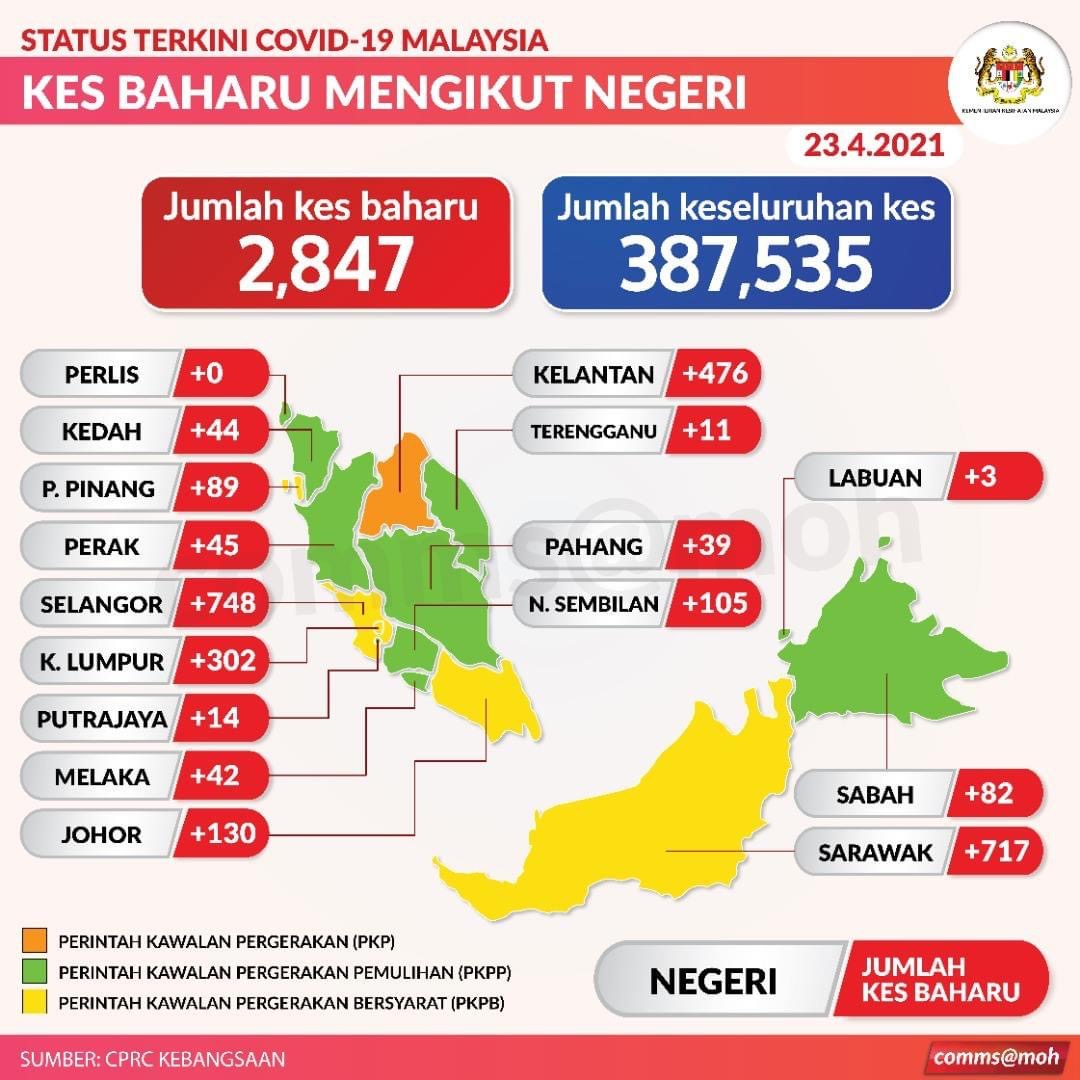 PUTRAJAYA 23 April – Selangor kembali mendahului kes jangkitan harian apabila melaporkan kes harian baharu tertinggi iaitu sebanyak 748 kes (26.3 peratus). Daripada jumlah ini, sebanyak 602 kes (80.5 peratus) adalah daripada kluster-kluster dan saringan kontak rapat kes positif Covid-19 yang aktif dijalankan di lapangan.