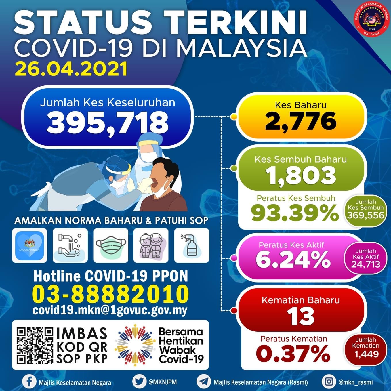 PUTRAJAYA 26 April – Malaysia terus merekodkan peningkatan kes jangkitan Covid-19 apabila menambah 2,776 kes harian baharu berbanding 2,690 semalam menjadikan jumlah keseluruhan kini sebanyak 395,718 kes.