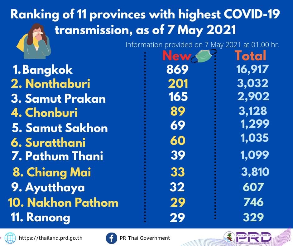 Bangkok merekodkan 869 kes diikuti Nonthaburi (201), Samut Prakan (165), 89 in Chon Buri (89), 69 in Samut Sakhon (69), 60 in Surat Thani (60), 39 in Pathum Thani (39), 33 in Chiang Mai (33), 32 in Ayutthaya (32) dan 29 kes masing-masing di Nakhon Pathom dan Ranong.