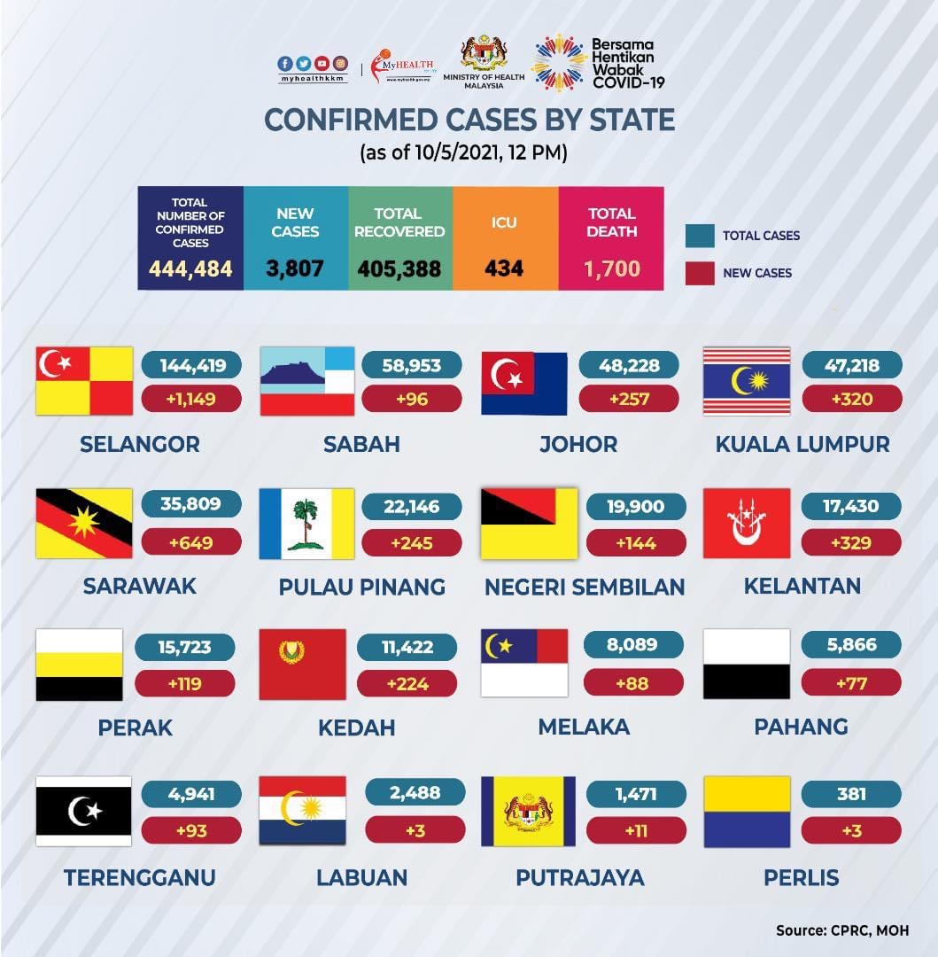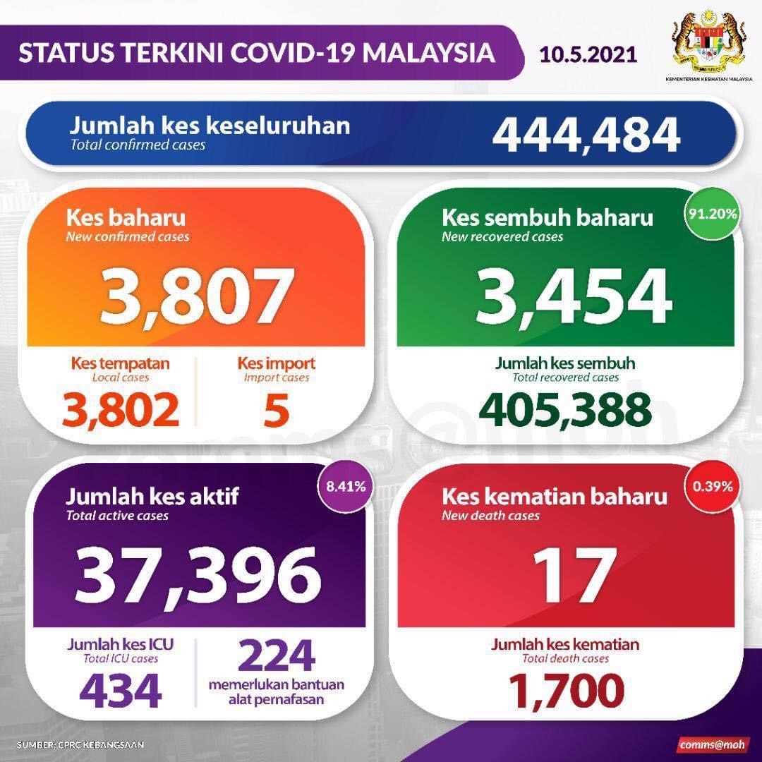 PUTRAJAYA 10 Mei – Malaysia terus merekodkan kes Covid-19 melebihi 3,000 apabila merekodkan sejumlah 3,807 kes baharu dalam tempoh 24 jam lepas, menjadikan kes kumulatif kini 444,484 kes.