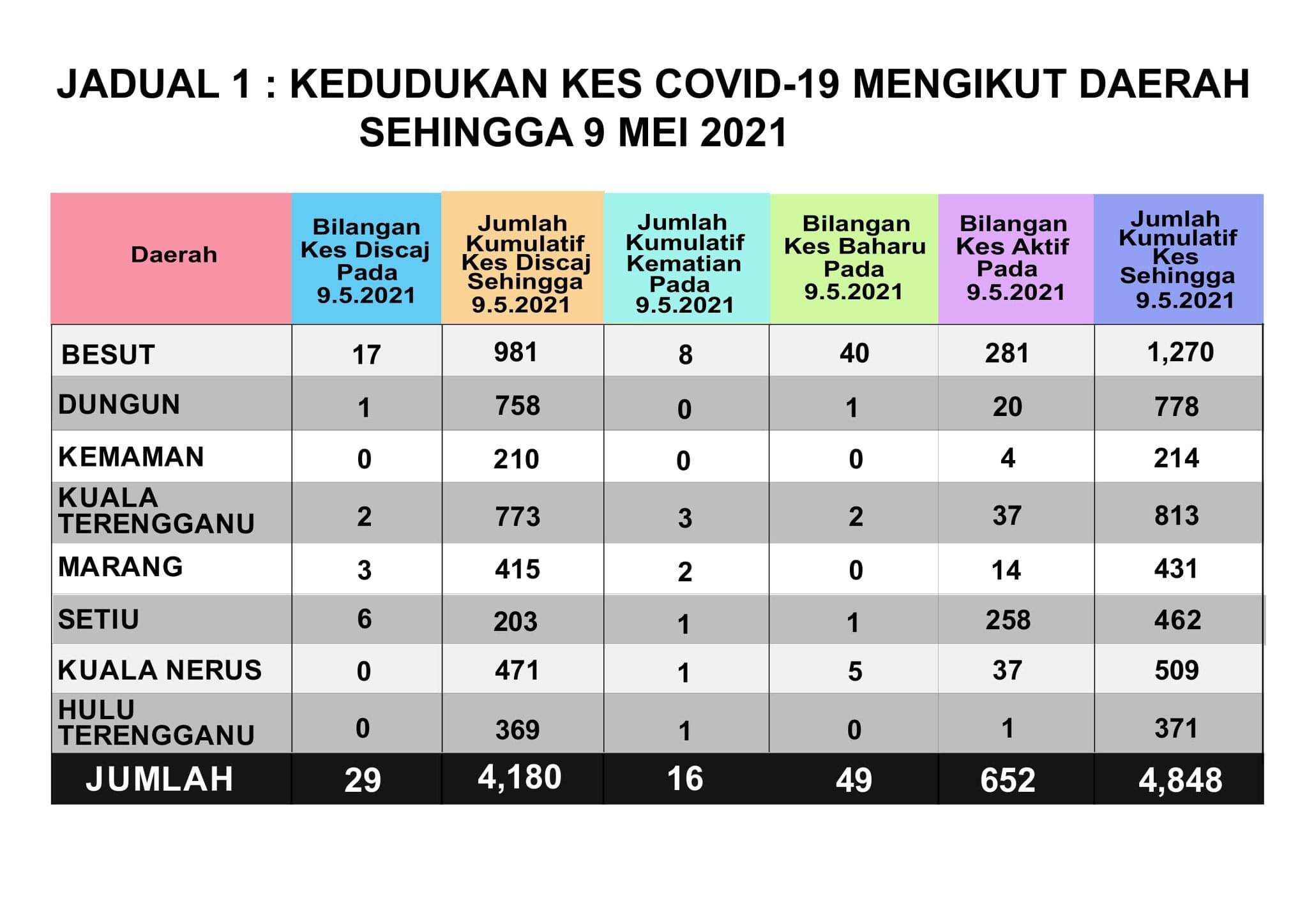 Ketika ini, 570 kes aktif berada dalam keadaan stabil dan diberikan rawatan biasa manakala sembilan kes menerima rawatan di Unit Rawatan Rapi Hospital Sultanah Nur Zahirah dan empat daripadanya memerlukan alat bantuan pernafasan.