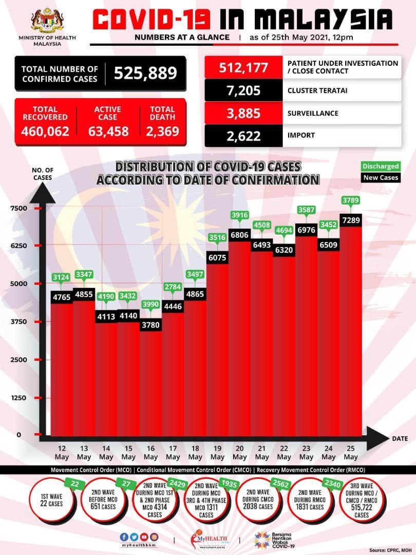 PUTRAJAYA 25 Mei – Angka 6,976 yang direkodkan sebagai tertinggi pada 23 Mei lalu tidak bertahan lama apabila jumlah kes baharu hari ini mencecah 7,289 kes menjadikan jumlah keseluruhan kini 525,889. Ketua Pengarah Kesihatan Dr Noor Hisham Abdullah berkata, jumlah mereka yang sembuh hari ini adalah 3,789 dengan kumulatif sembuh 460,062 kes. Beliau juga memaklumkan terdapat 60 kematian hari ini, sekali gus menjadikan kumulatif kematian adalah 2,369 kes. Jumlah kes yang kini dirawat di Unit Rawatan Rapi (ICU) adalah 726 kes manakala kes yang memerlukan bantuan alat pernafasan adalah 373…