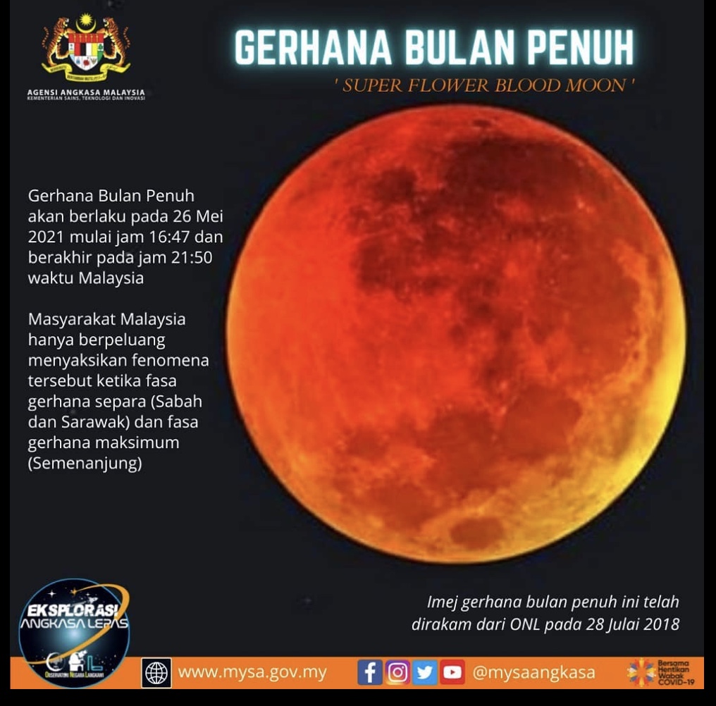 Jom sama-sama kita saksikan penstriman langsung Gerhana Bulan Penuh “Super Flower Blood Moon” di akaun media sosial Facebook dan Youtube Planetarium Negara pada hari Rabu, 26 Mei 2021.