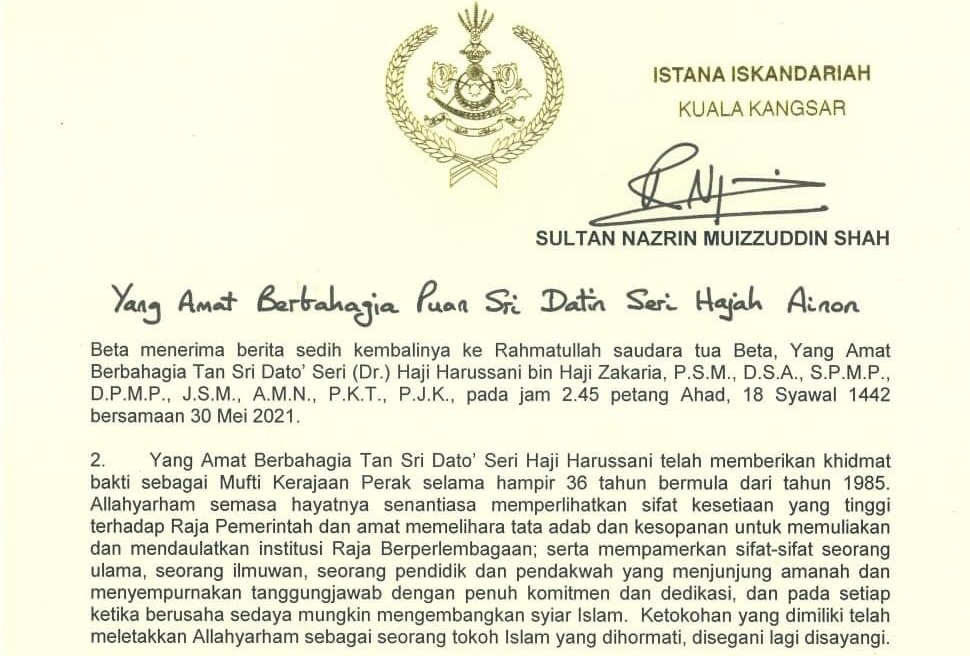 Istana Iskandariah Kuala Kangsar dalam kenyataan hari ini menyertakan warkah takziah Baginda kepada Puan Sri Ainon Abdul Ghani, iaitu balu kepada Allahyarham Harussani.
