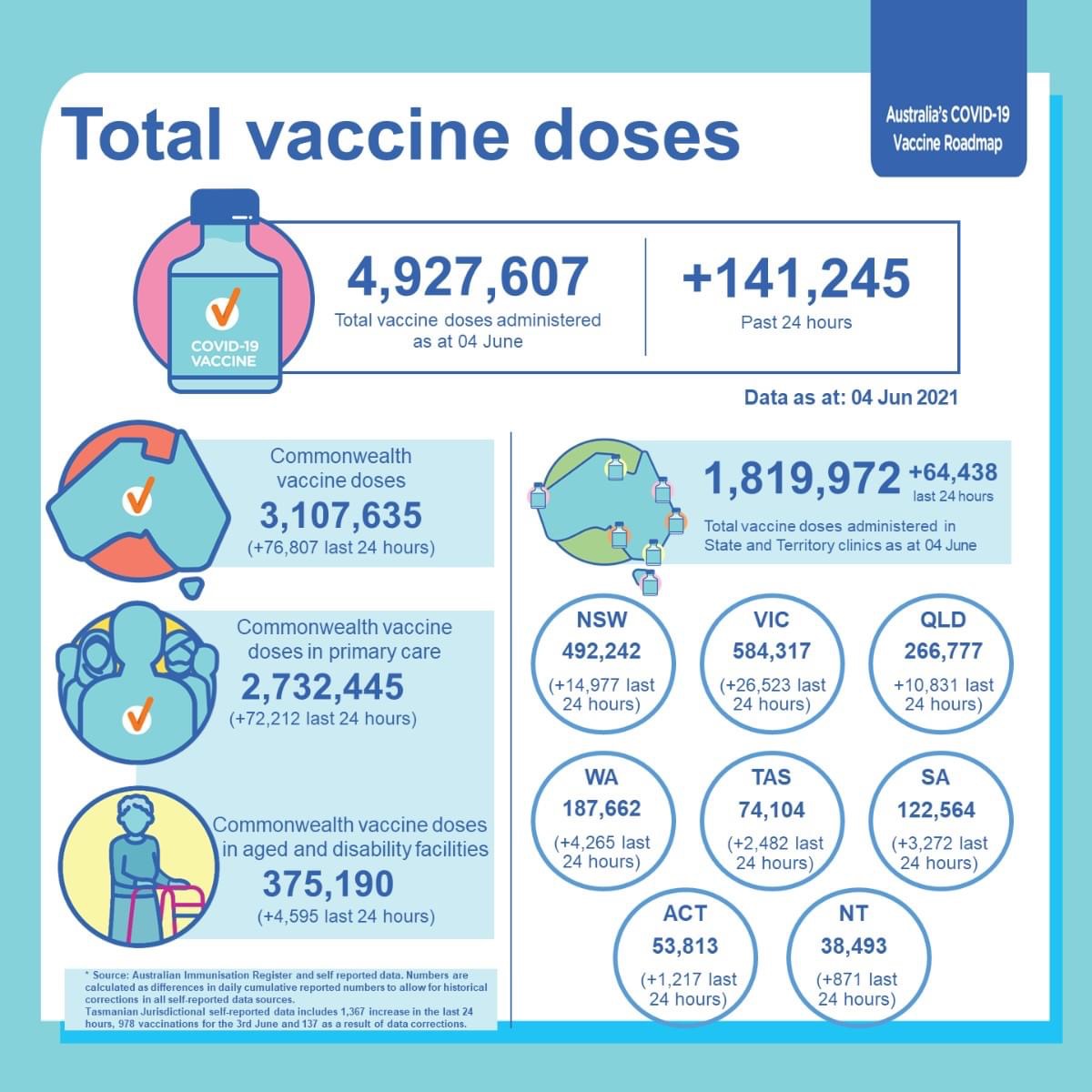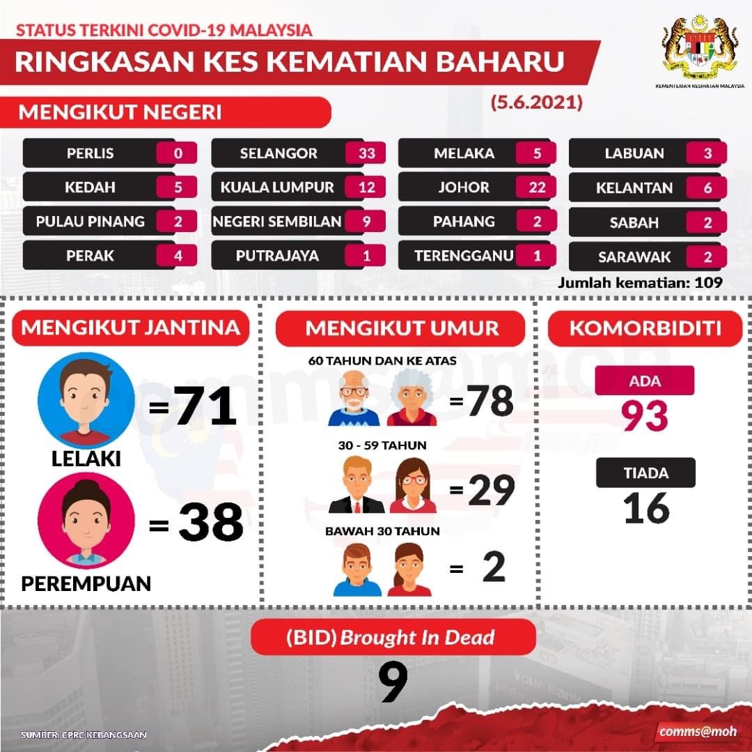 Seramai 90,277 individu telah menerima vaksin pada 4 Jun 2021 dimana 85,361 daripadanya menerima dos pertama. Ini menjadikan jumlah keseluruhan mereka yang telah menerima vaksin di negara ini melebihi 3.4 juta orang.