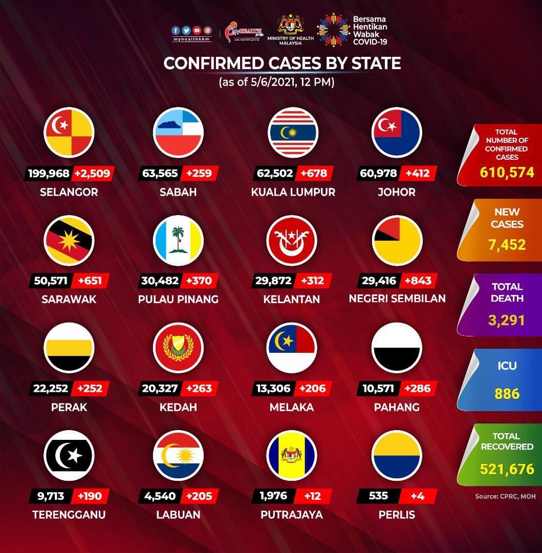 PUTRAJAYA 5 Jun – Selangor hampir mencatatkan 200,000 kes jangkitan Covid-19 selepas angka positif baharu hari ini merekodkan 2,509 menjadikan jumlah keseluruhan kes di negeri itu mencecah 199,968. Daripada 7,452 kes yang dilaporkan seluruh negara, Selangor terus menjadi penyumbang terbesar diikuti Negeri Sembilan 843 kes, yang menunjukkan peningkatan berbanding 709 semalam. Beberapa negeri menunjukkan peningkatan termasuk Negeri Sembilan merekodkan 843 kes berbanding 709 semalam, Kelantan 312 (286) dan Pahang 286 (146). Negeri-negeri lain menunjukkan penurunan termasuk Kuala Lumpur 678, Sarawak 651, Johor 412 dan Pulau Pinang 370.