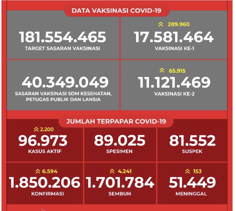 JAKARTA 5 Jun – Indonesia hari ini menambah kes positif Covid-19 sebanyak 6,594 orang yang membawa kepada jumlah keseluruhan 1,850,206 dengan kes aktif bertambah sebanyak 2,200 menjadikan jumlahnya sebanyak 96,973. Pada masa yang sama jumlah pesakit yang pulih meningkat kepada 1,701,784 selepas 4,241 lagi pesakit dilaporkan sembuh manakala kematian pula mencecah 51,449 berikutan 153 lagi pesakit meninggal dunia. Lima provinsi merekodkan kes harian tertinggi iaitu Jakarta 1,317 kes dan menjadikan kumulatifnya 434,116, Jawa Tengah 1,092 (kumulatifnya 204,342), Jawa Barat 993 (318,892), Riau 507 (62,617) dan Sumatera Barat 467 (45,617). Jakarta…