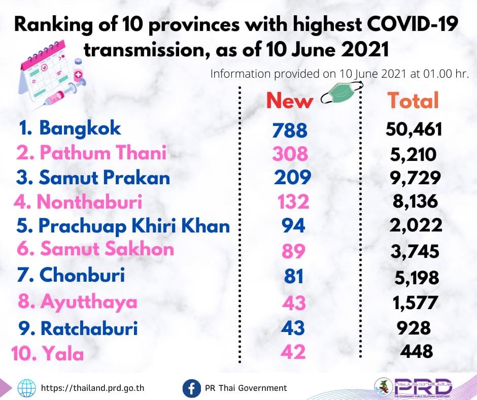 Bangkok pula merekodkan kes harian tertinggi iaitu 788 kes manakala kes import melibatkan warganegara Thailand yang tiba dari United Kingdom dan Kemboja.