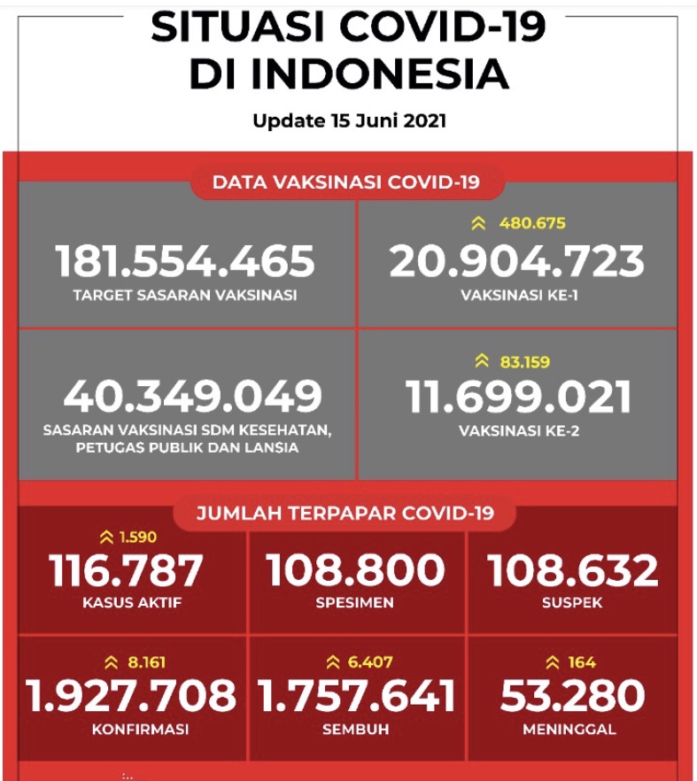 JAKARTA 15 Jun – Indonesia menjangkakan gelombang baharu jangkitan Covid-19 memuncak pada awal Julai, berikutan varian Delta yang sangat mudah menular kini dominan di beberapa kawasan. Pada masa yang sama, ruang rawat di hospital-hospital di Jakarta juga sudah berada pada tahap 75 peratus. Hari ini Indonesia merekodkan 8,161 kes kes baharu Covid-19 yang menunjukkan sedikit penurunan yang membawa kepada jumlah kumulatif 1,927,708. Angka kematian pula sebanyak 164 orang menjadikan 53,280 orang manakala kes sembuh merekodkan 6,407 menjadikan jumlah keseluruhan 1,757,641. Bagi mencegah penularan Covid-19, Indonesia memutuskan untuk melanjutkan sekatan aktiviti…