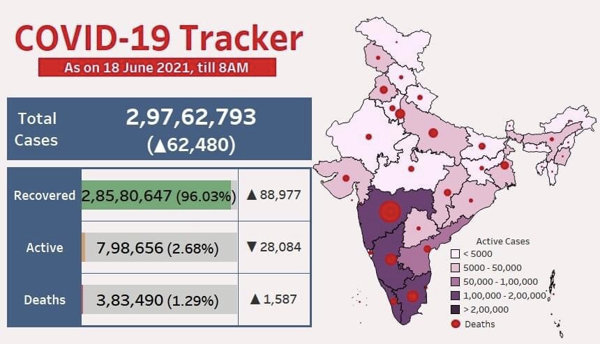 NEW DELHI 18 Jun – India merekodkan 62,480 kes baharu Covid-19 yang membawa kepada jumlah keseluruhan 29,762,793 kes Menurut Kementerian Kesihatan, sebanyak 1,587 kematian dicatatkan dalam tempoh itu, menjadikan jumlah yang meninggal dunia sebanyak 383,490. Ini adalah hari ke-11 berturut-turut kes keseluruhan dilaporkan di bawah100,000, setelah mencecah lebih 400,000 selama beberapa hari pada April dan Mei. Setakat ini terdapat 798,656 kes aktif, dengan penurunan 28,084 kes sepanjang 24 jam lepas. Sebanyak 28,580,647 pesakit telah pulih dan keluar dari hospital di seluruh negara, dengan 88,977 daripadanya dibenarkan pulang sejak pagi Khamis.…
