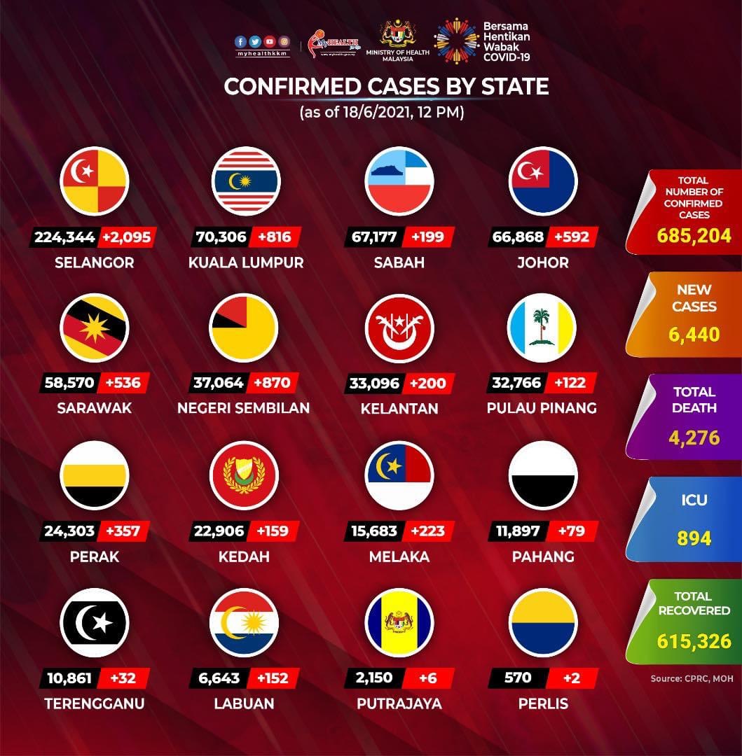 PUTRAJAYA 18 Jun – Kes jangkitan baharu Covid-19 kembali meningkat dan Selangor terus menjadi penyumbang terbesar apabila merekodkan 2,095 kes berbanding 6,440 kes yang direkodkan negara hari ini. Selangor mencatatkan peningkatan kes hari ini berbanding 1,858 kes semalam dan 1,914 pada Rabu. Negeri Sembilan walaupun menunjukkan penurunan merekodkan kes yang tinggi dengan 870 berbanding 1,086 semalam. Wilayah Persekutuan Kuala Lumpur mencatatkan peningkatan iaitu 816 berbanding 641 semalam, Johor 592 (449), Perak 357 (30), Melaka 223 (184), Kelantan 200 (154), Wilayah Persekutuan Labuan 152 (97), Pulau Pinang 122 (97) dan Pahang…