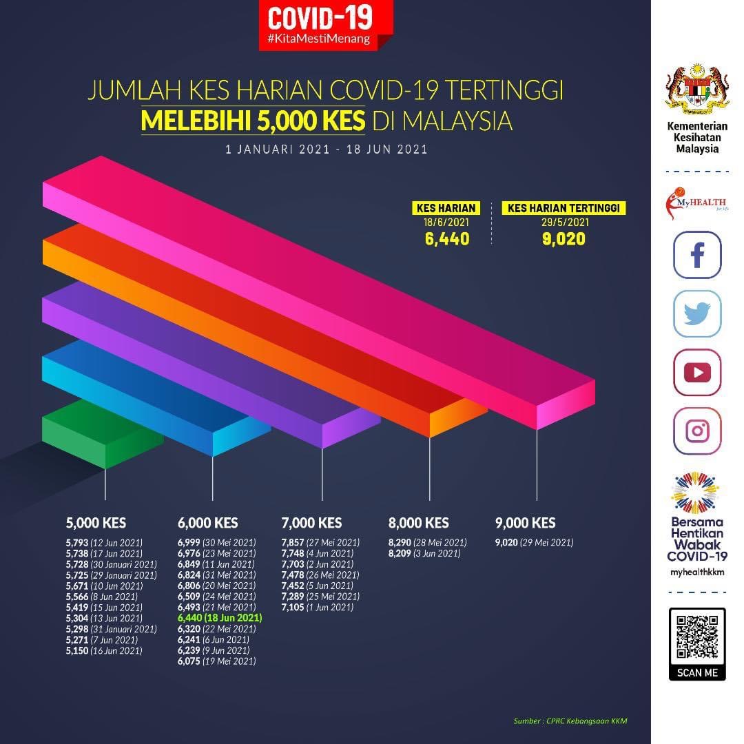 PUTRAJAYA 18 Jun – Naik kembali, jumlah kes harian Covid-19 melebihi 6,000 apabila merekodkan 6,440 kes dalam tempoh 24 jam lalu sekali gus menjadikan jumlah keseluruhan 685,204 kes. Berdasarkan jumlah jangkitan baharu yang dilaporkan, terdapat lima kes import yang menerima jangkitan dari luar negara manakala kes aktif dengan kebolehjangkitan Covid-19 kini sebanyak 65,602 kes. Ketua Pengarah Kesihatan, Dr Noor Hisham Abdullah berkata, Malaysia turut mencatat pertambahan 74 korban menjadikan jumlah kumulatif kes kematian kini sebanyak 4,276. Kematian hari ini melibatkan 28 kes di Selangor, sembilan di Negeri Sembilan, masing-masing tujuh…