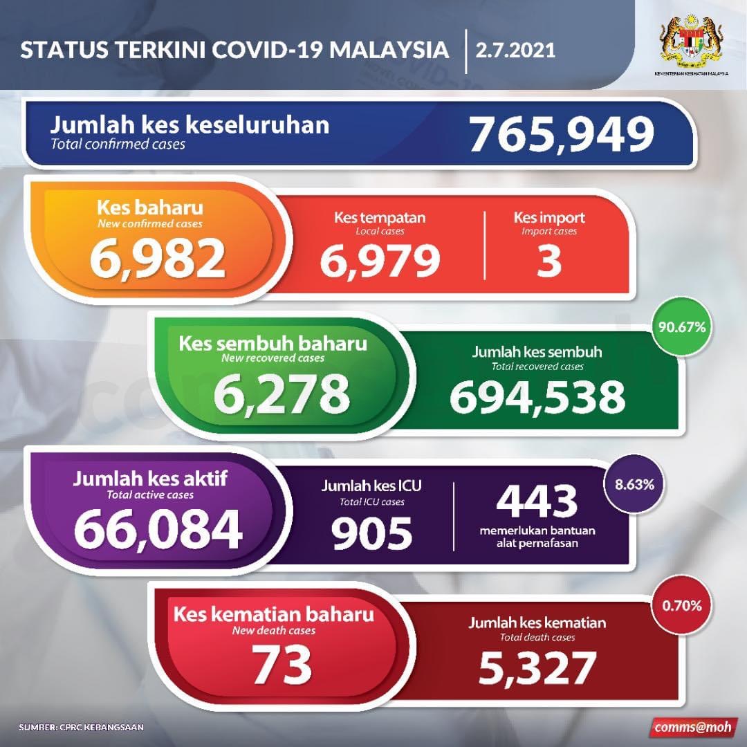 PUTRAJAYA 2 Julai – Kementerian Kesihatan merekodkan 73 kematian akibat Covid-19 dan 6,982 pesakit baharu hari ini, kata Ketua Pengarah Kesihatan, Dr Noor Hisham Abdullah.