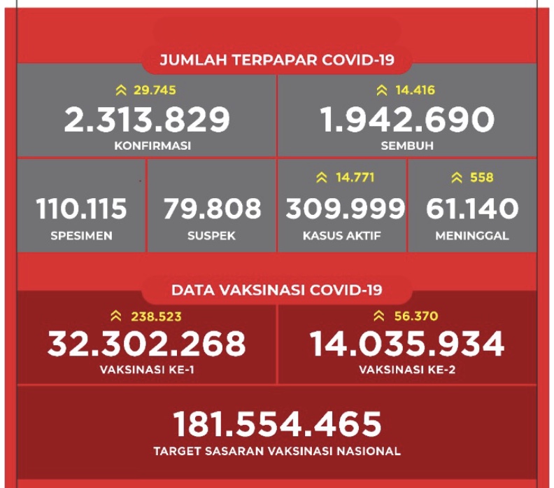 JAKARTA 5 Julai – Indonesia sekali lagi merekodkan kes harian tertinggi apabila angka jangkitan menghampiri 30,000 orang dengan mencatatkan 29,745 kes baharu menjadikan jumlah keseluruhan 2,313,829. Kes harian tertinggi sebelum ini adalah 27,913 orang yang direkodkan pada 3 Julai lalu. Bagi kes kematian pula, ia juga rekod tertinggi setakat ini dengan 558 kes menjadikan jumlah keseluruhan 61,140 orang telah meninggal dunia. Lima provinsi menambah kes baharu tertinggi iaitu Jakarta 10.903 kes, Jawa Barat 6.971, Jawa Tengah 3.447, Jawa Timur 1.543, Yogyakarta 1.465, Banten: 541 dan Nusa Tenggara Timur 461. Sementara…