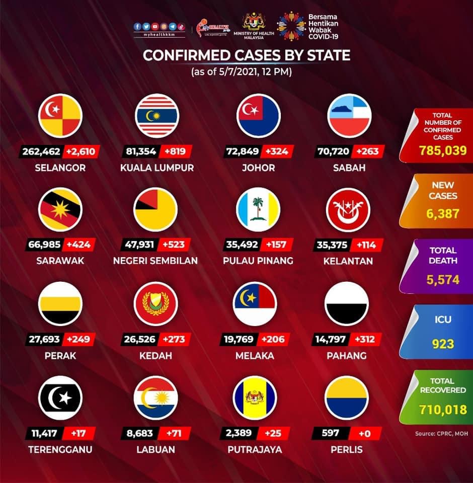 PUTRAJAYA 5 Julai – Selangor menambah 348 kes baharu Covid-19 hari ini, dengan melaporkan peningkatan kes harian kepada 2,610 kes berbanding 2,262 semalam menjadikan jumlah keseluruhan kes di negeri itu 262,462 kes. Perlis pula sama seperti semalam tidak merekodkan sebarang kes baharu hari ini. Beberapa negeri merekodkan pertambahan kes berbanding angka semalam termasuk Wilayah Persekutuan Kuala Lumpur, Sabah, Sarawak, Pahang dan Wilayah Persekutuan Putrajaya. Negeri-negeri lain mencatatkan penurunan kes berbanding angka semalam. Kuala Lumpur merekodkan 819 kes baharu berbanding 616 semalam, Sabah 263 (228), Sarawak 424 (365), Pahang 312 (95)…
