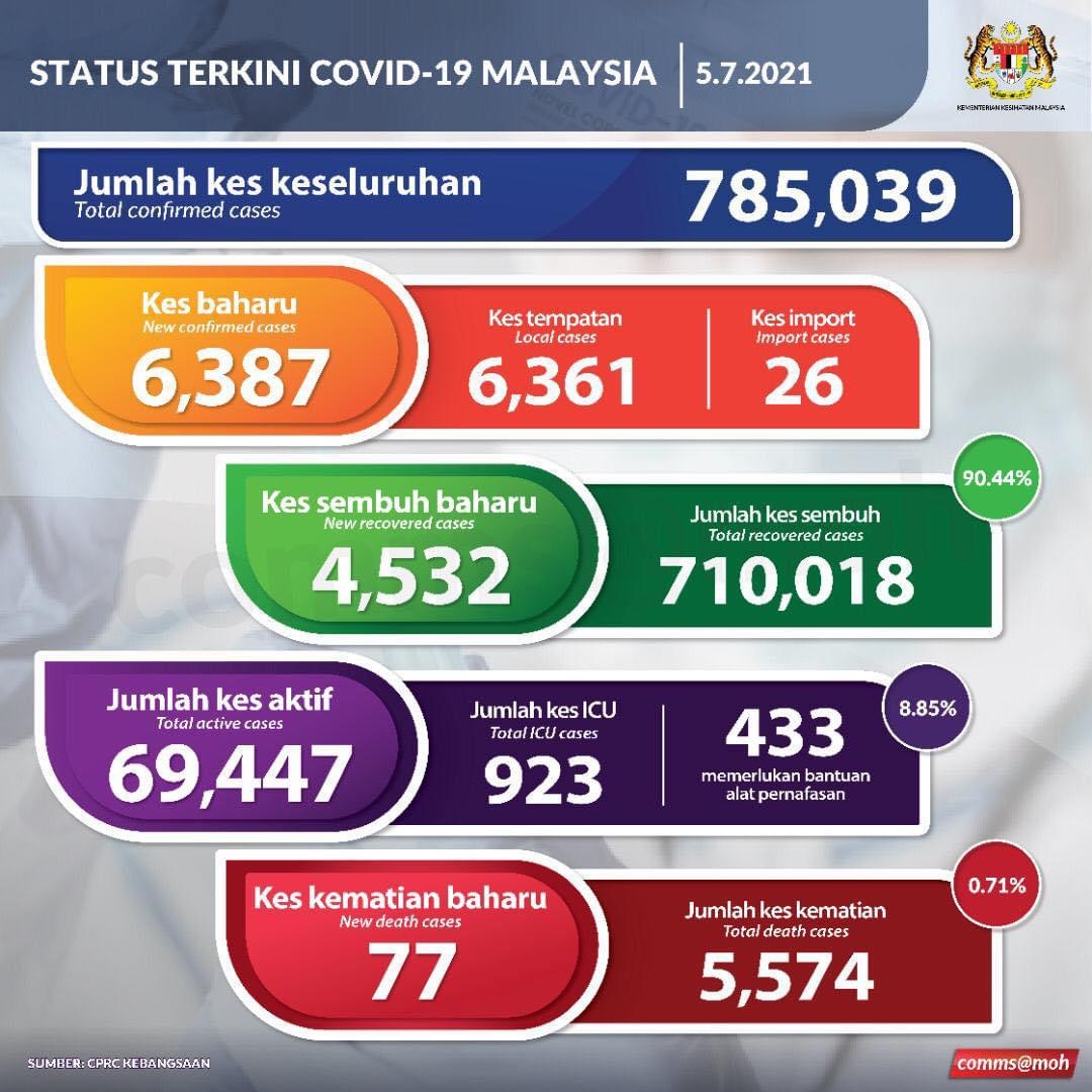 PUTRAJAYA 5 Julai – Kes jangkitan baharu Covid-19 terus menunjukkan peningkatan dengan merekodkan 6,387 dalam tempoh 24 jam berbanding 6,045 semalam menjadikan jumlah keseluruhan 785,039 kes. Daripada jumlah itu, 26/adalah kes import yang melibatkan 13 warganegara dan 13 bukan warganegara manakala 6,361 kes tempatan melibatkan 4,864 warganegara dan 1,497 bukan warganegara. Ketua Pengarah Kesihatan, Dr Noor Hisham Abdullah memaklumkan, jumlah kes sembuh pula sebanyak 4,532 dengan kumulatif 710,018 orang pulih sementara kes aktif pula sebanyak 69,447. Pada masa yang sama, sejumlah 77 kes kematian dilaporkan hari ini menjadikan jumlah korban akibat…