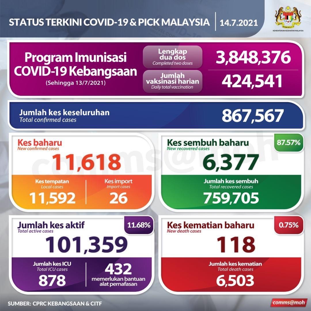 PUTRAJAYA 14 Julai – Dua hari berturut-turut kes harian Covid-19 kekal melebihi 11,000 dengan 11,618 kes dilaporkan hari ini, yang tertinggi pernah direkodkan di negara ini.