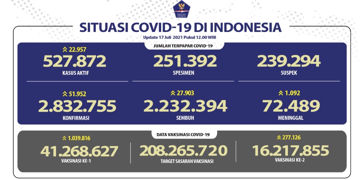 JAKARTA 17 Julai – Berbanding 54,000 kes positif semalam, jumlah kes jangkitan Covid-19 yang direkodkan hari ini adalah 51,952 dengan jumlah kematian pula 1,092, kurang daripada 1,205 semalam.