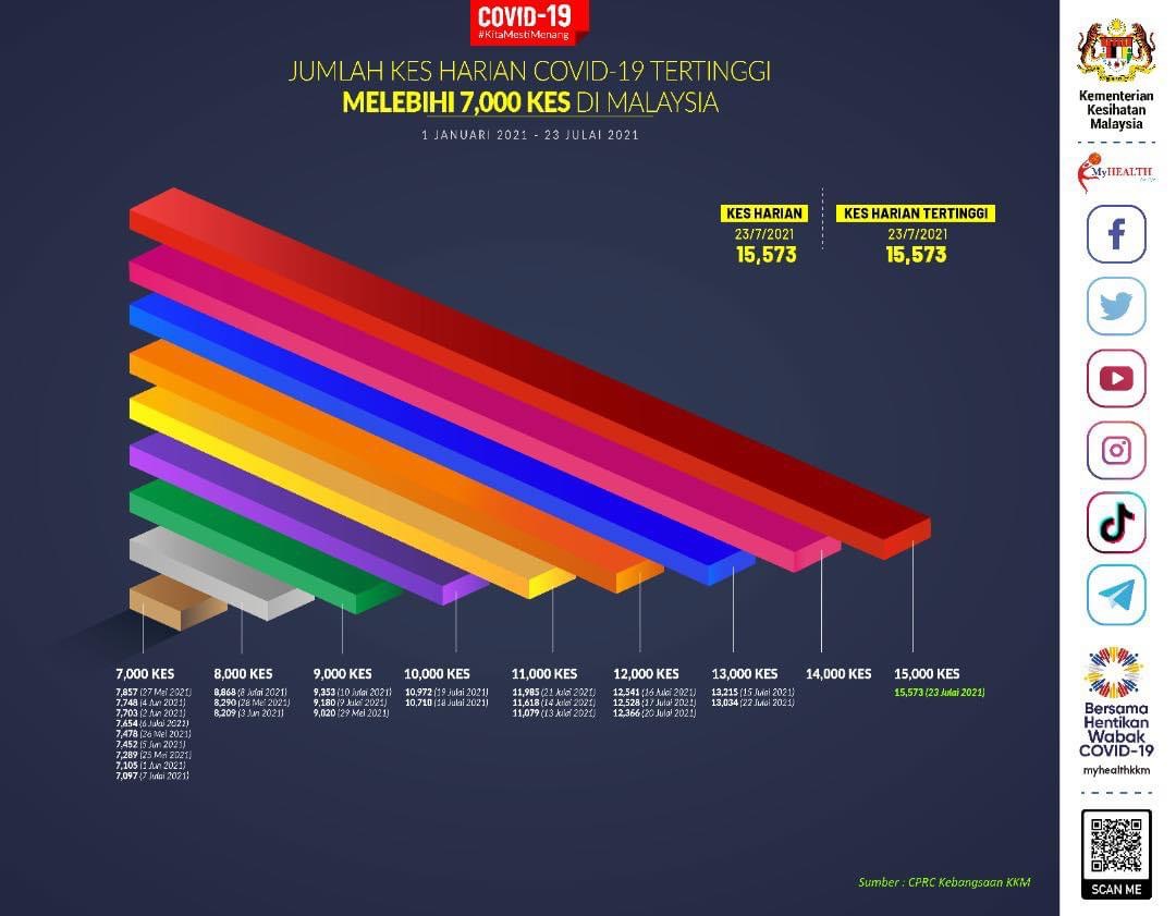 PUTRAJAYA 23 Julai – Sekali lagi berlaku lonjakan kes apabila angka jangkitan hari ini terus ‘melompat’ ke angka 15,000 selepas merekodkan 13,034 kes semalam. Sebelum ini, pada 15 Julai lalu, angka jangkitan melonjak kepada angka 13 selepas dua hari berturut-turut merekodkan angka 11,000. Jumlah kes yang direkodkan hari ini adalah yang tertinggi dengan merekodkan 15,573 termasuk 32 kes import yang menjadikan jumlah keseluruhan 980,491. Kes tempatan yang direkodkan hari ini adalah 15,541 di mana 13,395 melibatkan warganegara, dan 2,146 bukan warganegara, manakala kes import pula melibatkan 12 warganegara dan 20…