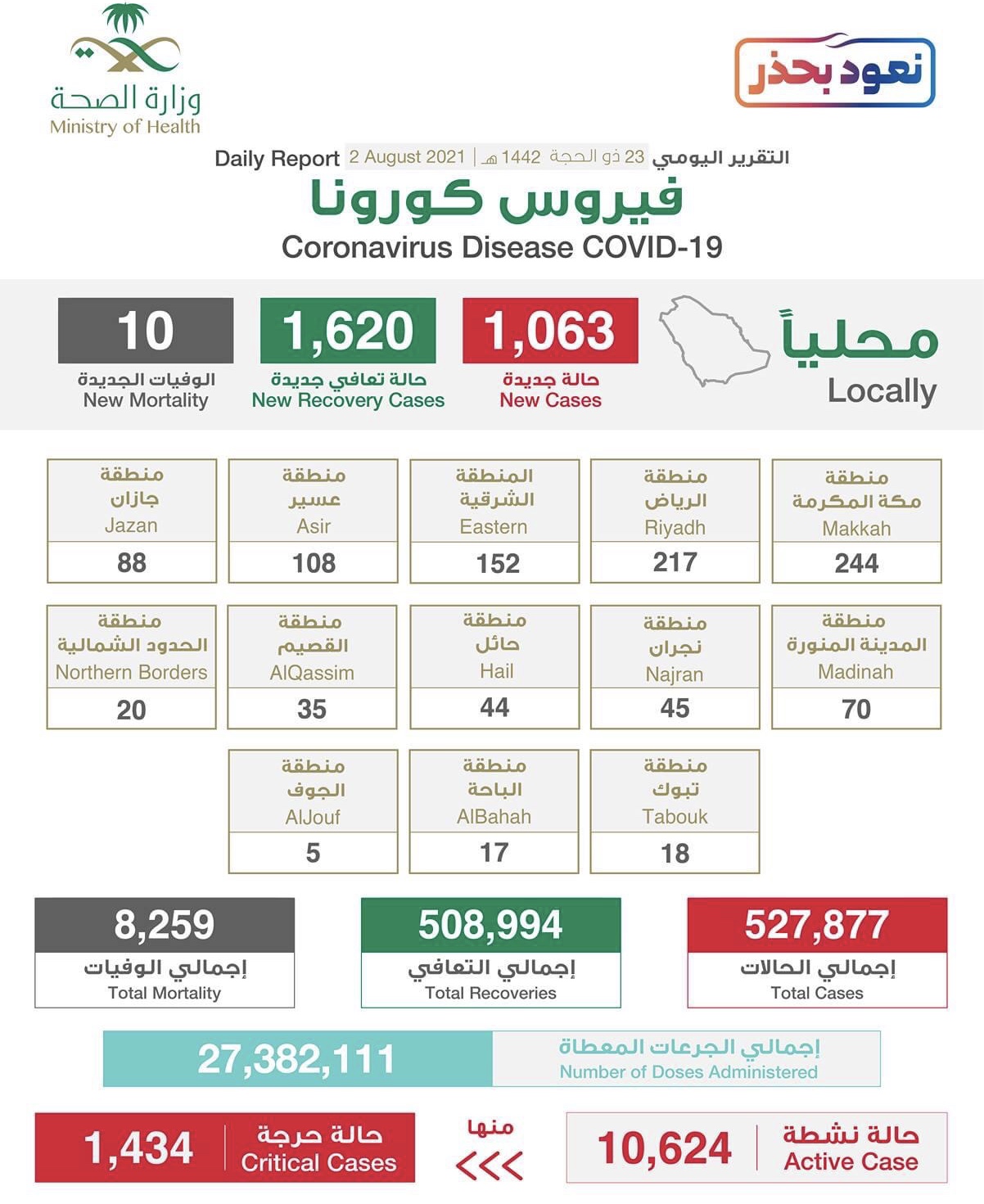 RIYADH 2 Ogos – Kes jangkitan Covid-19 di Arab Saudi menunjukkan penurunan dengan merekodkan 1,063 kes baharu hari ini berbanding 1,084 semalam dan 1,146 yang dicatatkan pada 31 Julai.
