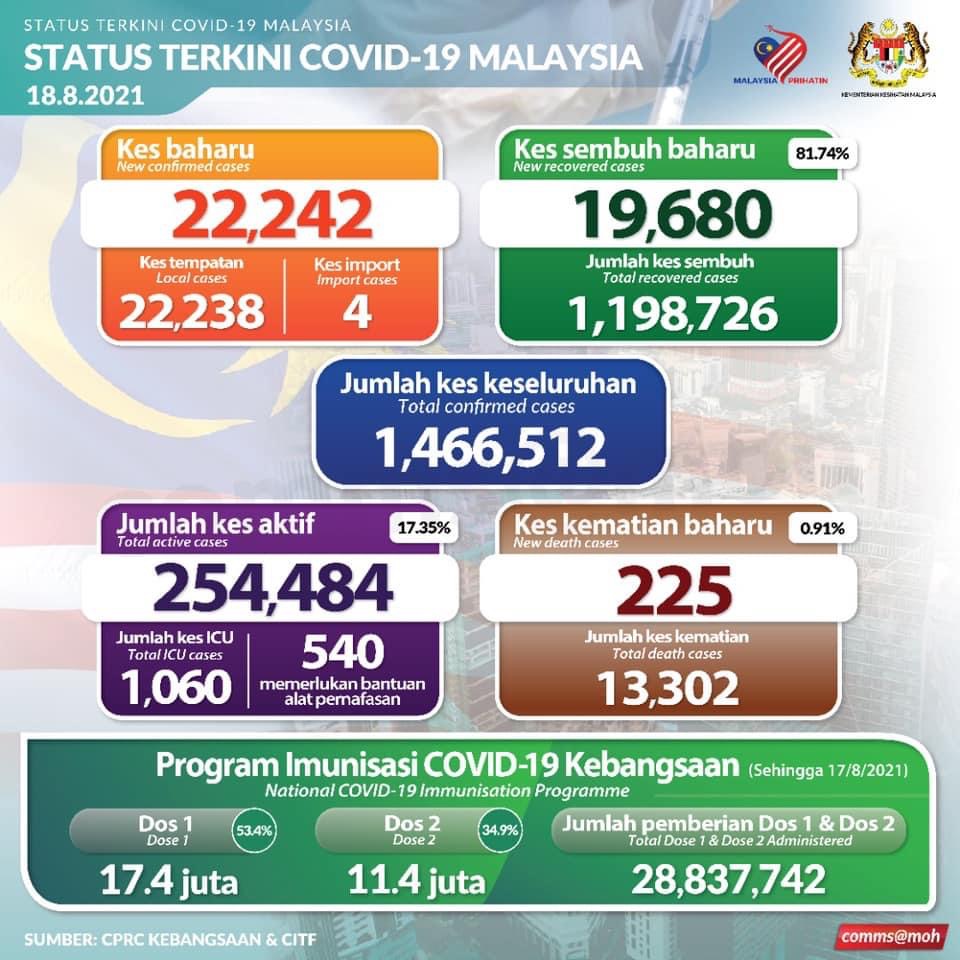 PUTRAJAYA 18 Ogos – Kes harian Covid-19 sekali lagi merekodkan angka tertinggi sebanyak 22,242 menjadikan jumlah keseluruhan kes positif di negara ini meningkat kepada 1,466,512 kes.