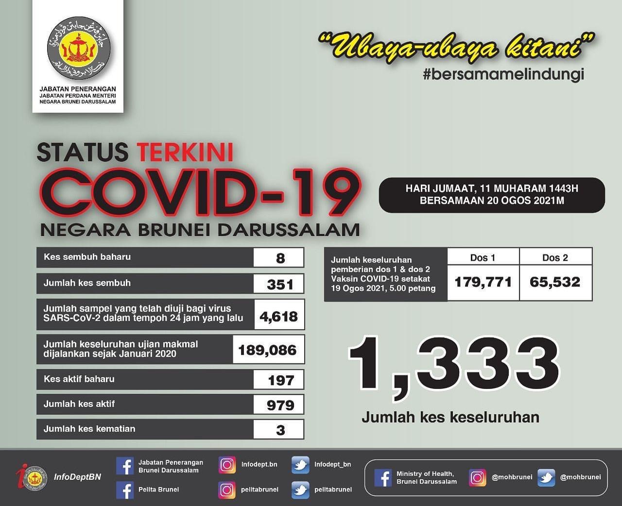 BANDAR SERI BEGAWAN 20 Ogos – Genap dua minggu selepas kes ‘pertama’ setelah 457 hari tanpa kes tempatan, Brunei merekodkan kes harian tertinggi hari ini dengan 197 kes menjadikan jumlah keseluruhan 1,333. Menteri Kesihatan, Dr. Md Isham Jaafar pada sidang media berkata, kenaikan mendadak itu dipengaruhi 106 kes tertunggak yang ujian makmal baru diperoleh manakala 91 kes dikesan melalui Jabatan Perkhidmatan Makmal Beliau pada masa yang sama mengesahkan satu kematian pesakit berusia 70 tahun belum divaksin .Kematian disebabkan sakit jantung dan tidak dikategorikan sebagai akibat Covid-19.. Mengenai kes hari ini,…