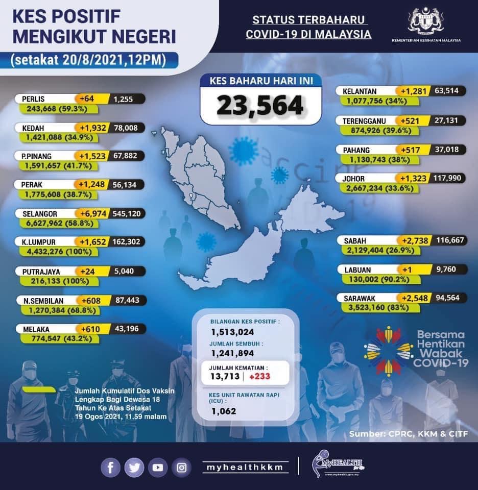 PUTRAJAYA 20 Ogos – Sama seperti semalam, sembilan negeri dan wilayah mencatatkan kes empat angka, didahului Selangor dengan 6,974, turun daripada 7,175 semalam sementara Perlis naik kepada 64 berbanding 42 semalam Sabah mencatatkan 2,738 kes, juga meningkat daripada 2,583 semalam dan Sarawak 2,548 berbanding 1,206 semalam. Peningkatan kes di beberapa negeri termasuk yang memasuki Fasa Tiga Pelan Pemulihan Negara (PPN) menunjukkan perkembangan penularan kes Covid-19 membimbangkan. Perlis yang sebelum ini berstatus negeri hijau, namun pergerakan rentas sempadan dan kelonggaran untuk makan di luar antara punca peningkatan kes di negeri itu.…