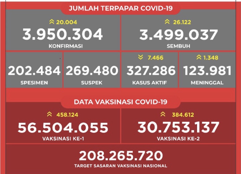 JAKARTA 20 Ogos – Kes sembuh terus menunjukkan peningkatan ketika jumlah jangkitan Covid-19 di Indonesia turun atau berada di sekitar 20,000 kes. Menurut kenyataan yang dikeluarkan, sebanyak 26,122 kes sembuh yang menjadikan jumlah keseluruhan 3,499,037 atau 88.6 peratus. Jawa Timur mencatatkan kes sembuh yang tinggi, 3,347 diikuti Jawa Barat 3,071, DI Yogyakarta 2,347, Kalimantan Timur 1,434 dan Sumatera Utara 1,311. Sebanyak 20,004 kes positif direkodkan yang menjadikan jumlah keseluruhan meningkat kepada 3,950,304 orang dengan kes aktif 327,286. Jawa Barat mencatatkan 2,742 kes positif, Jawa Timur 2,508, Sumatera Utara 1,481,, Jawa…