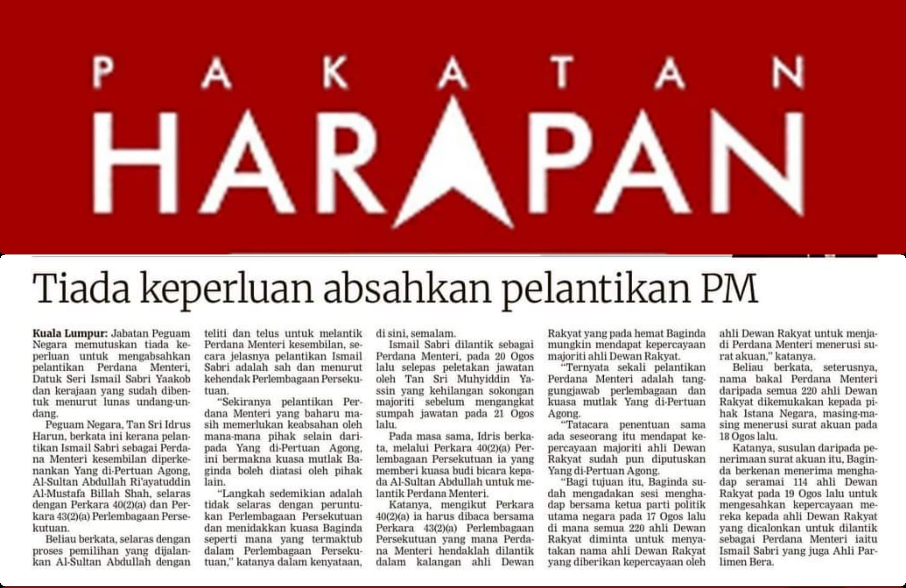 KUALA LUMPUR 5 Sept. – Majlis Presiden Pakatan Harapan (MPPH) mendesak Peguam Negara, Idrus Harun meletak jawatan kerana didakwa derhaka, dan mengkhianati Perlembagaan Persekutuan dan sistem demokrasi berparlimen. Desakan itu berikutan kenyataan Idrus bahawa undi percaya tidak perlu dilakukan di persidangan Dewan Rakyat sebagai tindakan melanggar titah Yang di-Pertuan Agong, Al-Sultan Abdullah Ri’ayatuddin Al-Mustafa Billah Shah. “Ia bertentangan dengan titah Yang di-Pertuan Agong kepada semua ketua parti sewaktu sesi menghadap di Istana Negara pada 17 Ogos lalu,” kata MPPH dalam satu kenyataan media hari ini. Dalam kenyataan media Istana Negara…